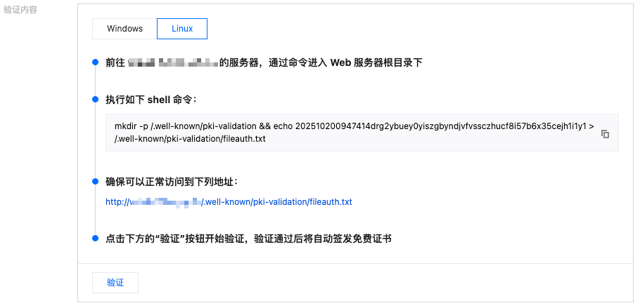 6. 查看需要配置的验证内容,文件验证需要您在当前域名站点的指定目录下上传验证所需的 TXT 文件,以 Linux 服务器为例,配置的方式如下: