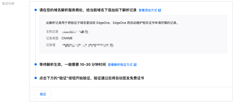 如果当前站点是使用 NS 接入/DNSPod 托管接入时,EdgeOne 将自动在当前的 DNS 服务器内添加申请证书所需的验证记录,请确保当前的 DNS 服务器状态正常生效,EdgeOne 将在一小时内发起证书申请验证。