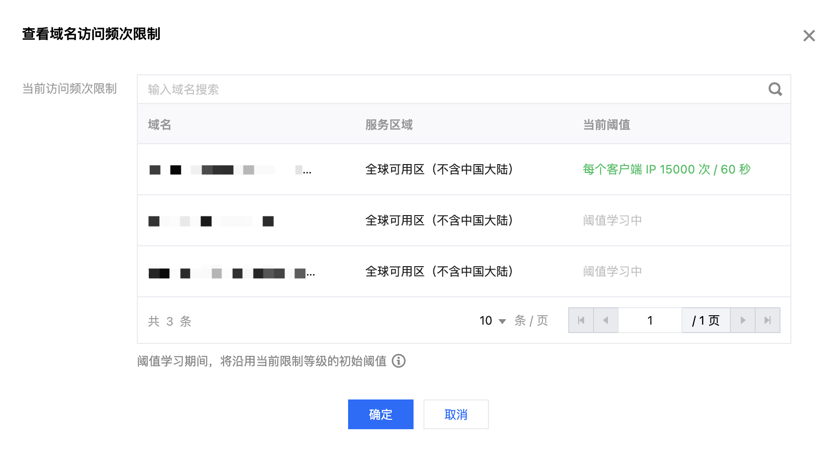 4. 在弹窗中查看当前防护策略所关联域名的对应访问频次限制。