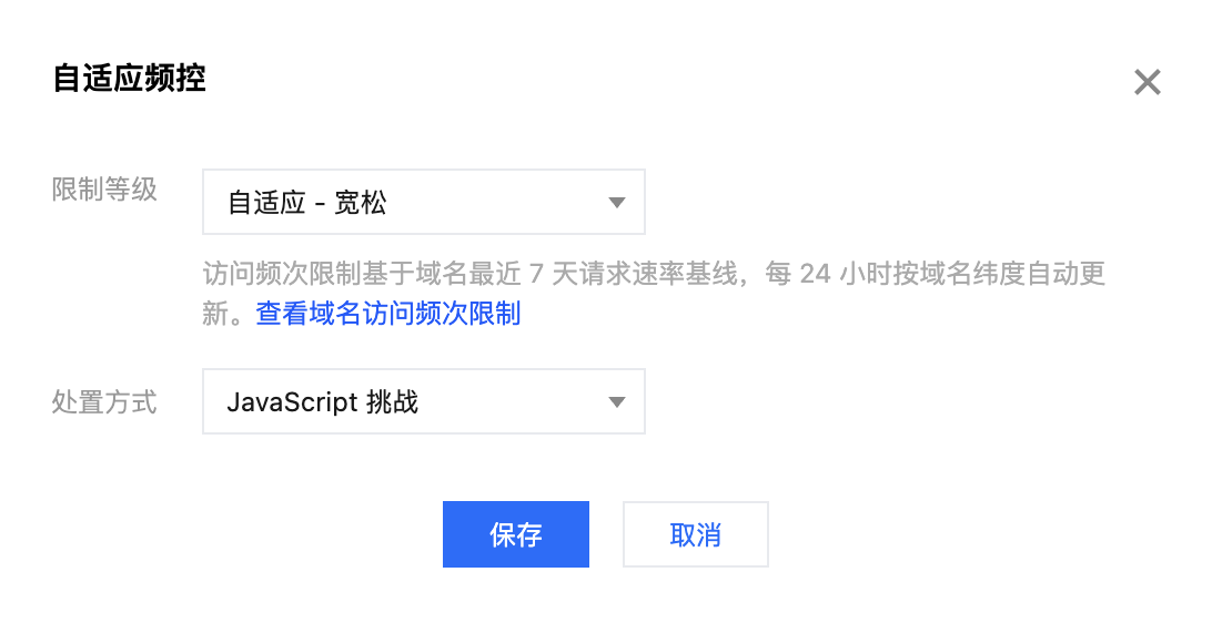 自适应 | 宽松(默认配置,推荐) | 适用于大部分无需实时数据交互或查询的 Web 业务场景。 | 2000 次 / 5 秒 |