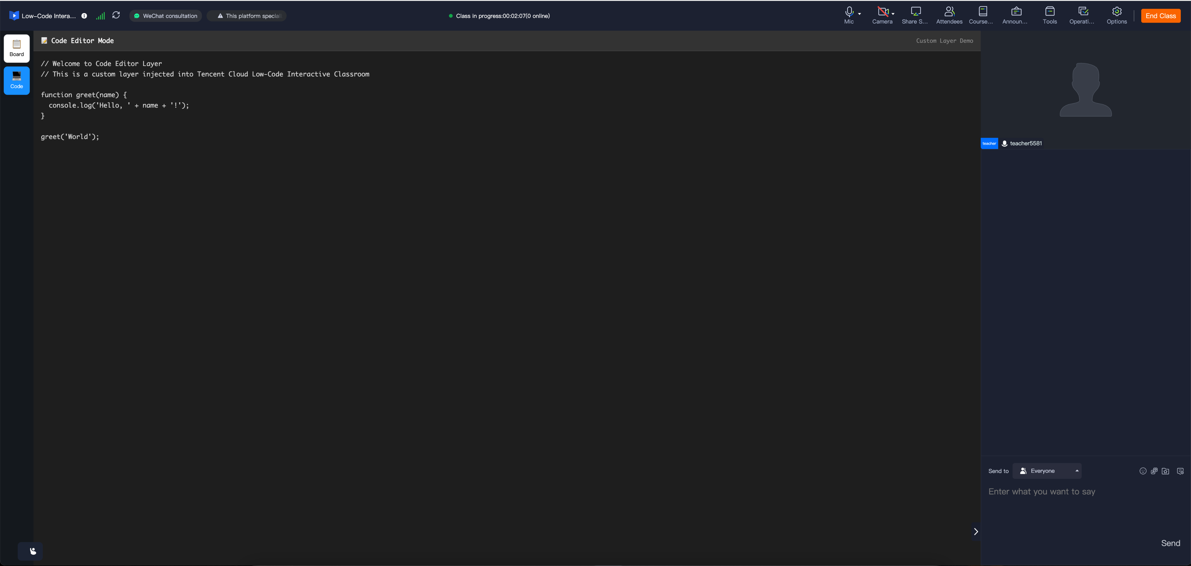 setState 将注册好的组件标签名注入到课堂前端项目中。// 获取 SDK 实例const sdkInstance = TCIC.SDK.instance;// 1. 配置自定义层级列表// 请注意, id 请不要占用我们内嵌默认白板的 "whiteboard"const customLayersConfig = [{id: 'code-editor', // 层级唯一标识 (Layer ID),用于 activateLayer 调用component: 'my-code-editor' // 上一步注册的 Web Component 标签名}// 可配置多个...];// 注入自定义层级配置sdkInstance.setState('TStateCustomLayers', customLayersConfig);// 2. 注入侧边切换 Tab 组件sdkInstance.setState('TStateLayerSwitcherTab', 'my-layer-switcher');
