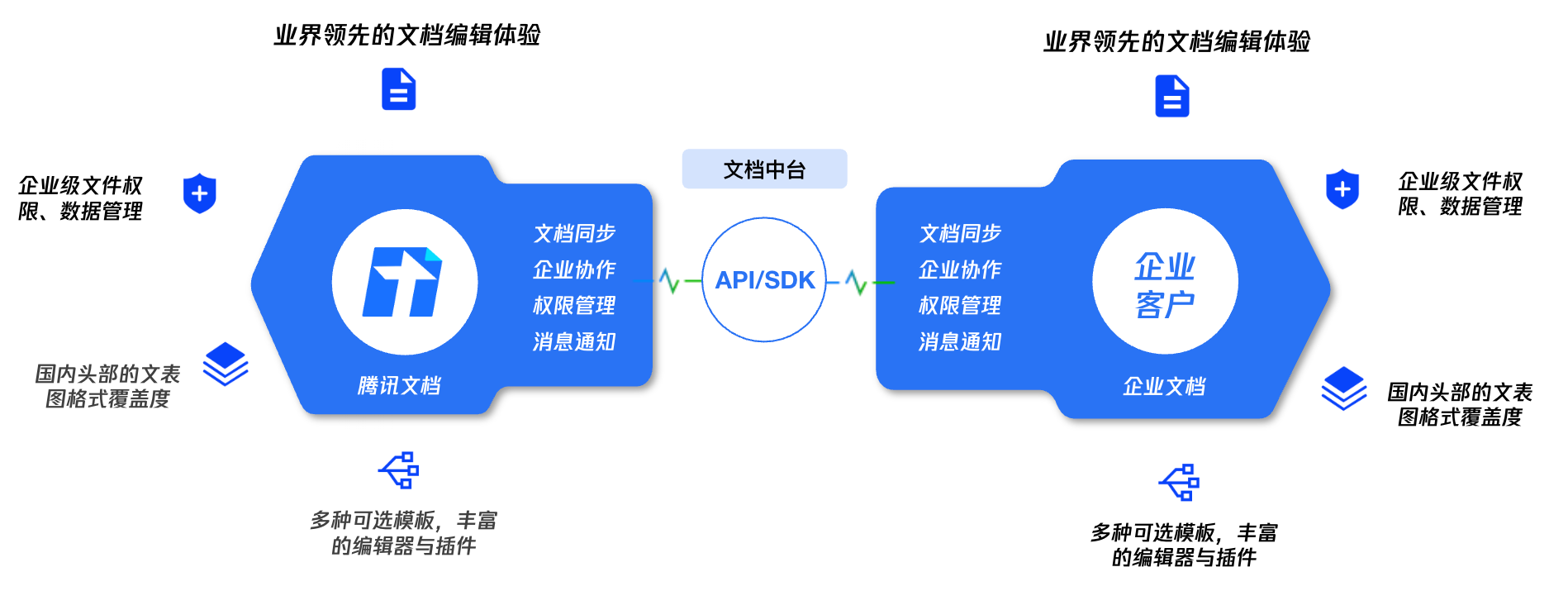 提供原子化协同体验,打通业务系统。全面的开放 API 接口及文档中台能力,无缝集成企业自有IM、OA、CRM、ERP 等业务系统,实现文档数据与业务数据双向同步,打破信息孤岛,让文档成为加速业务流转的“中间枢纽”。