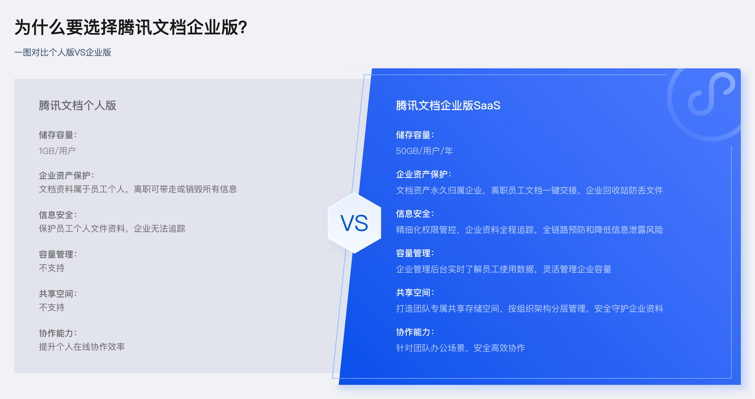 更高存储容量:相较于个人版只有1GB/用户,企业版为每个组织开放了50GB/用户/年的存储空间,充分满足企业知识存储与管理需求;同时还在管理后台提供了容量管理的入口,实时了解员工容量使用数据,合理分配、灵活管理企业容量。