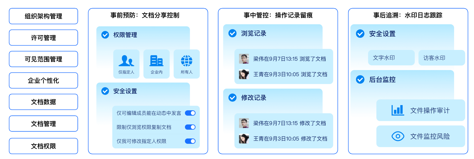 事后:文档管理员可对文档自定义添加水印,企业管理员可在后台添加强制水印,并支持文档审计能力,操作记录留痕,全方位管理企业文档安全。