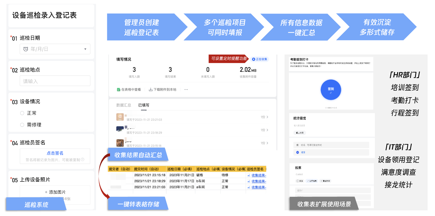 在零售、制造等行业中,门店和车间的巡检是一个需要在移动端便捷操作录入的场景,收集表表单就能很好满足这个需求,收集表以非常友好的「问卷」呈现形式,可以让巡检员在手机端也能很好的进行填报和录入工作;录入之后的信息实时汇总在表格中,无需管理员手动导入导出,还可一键生成可视化图表,非常方便。