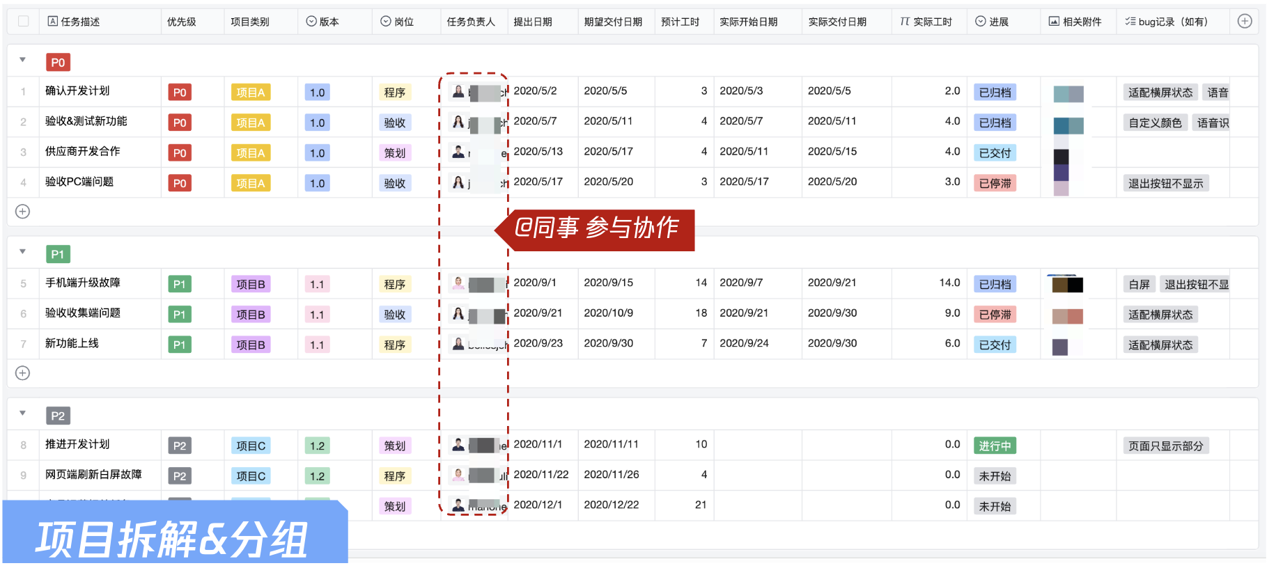 在表格视图中,使用工具栏中的分组能力,按照需求的优先级进行分组,可以直观的看到每个优先级下面的任务信息。例如:在下图中,P0优先级的任务有4个,P1优先级的任务有3个等。