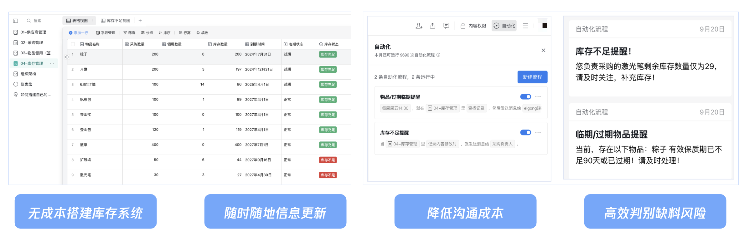 降低沟通成本:通过自动化可以设置各种业务的消息通知,例如物品过期、临期提醒,库存不足提醒,再也不用人工发消息,信息触达更及时,沟通更高效。