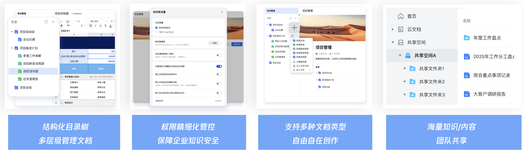 企业进行知识管理,本质上是通过系统化地整合、传递、应用和创新知识,将 “知识” 这一核心无形资产转化为实际竞争力。在复杂多变的市场环境中,知识管理对企业的生存与发展具有多维度、深层次的价值。而腾讯文档为企业打造的统一知识管理门户——共享空间,能有效解决这个问题。共享空间支持如下功能: