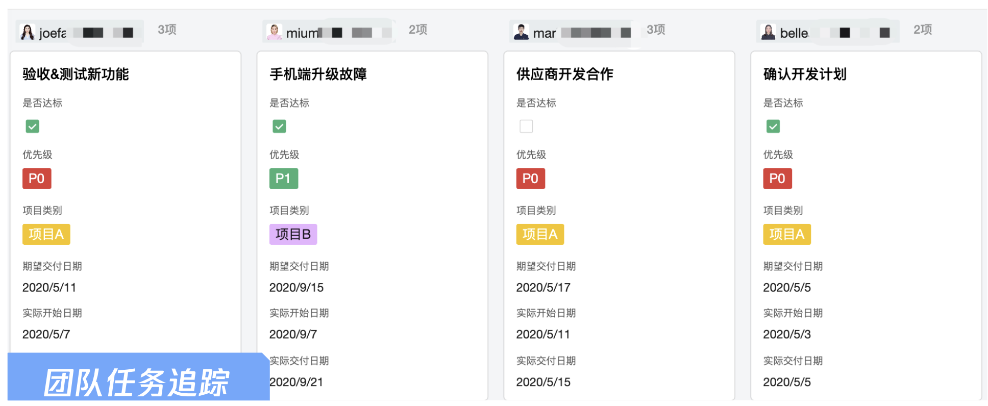 除了按照「项目所处阶段」进行看板呈现外,还可以按照项目负责人展示看板,每个责任人可以重点关注自己的任务完成情况,而项目总负责人则可以清晰看到不同人员的完成情况,便于团队任务追踪。