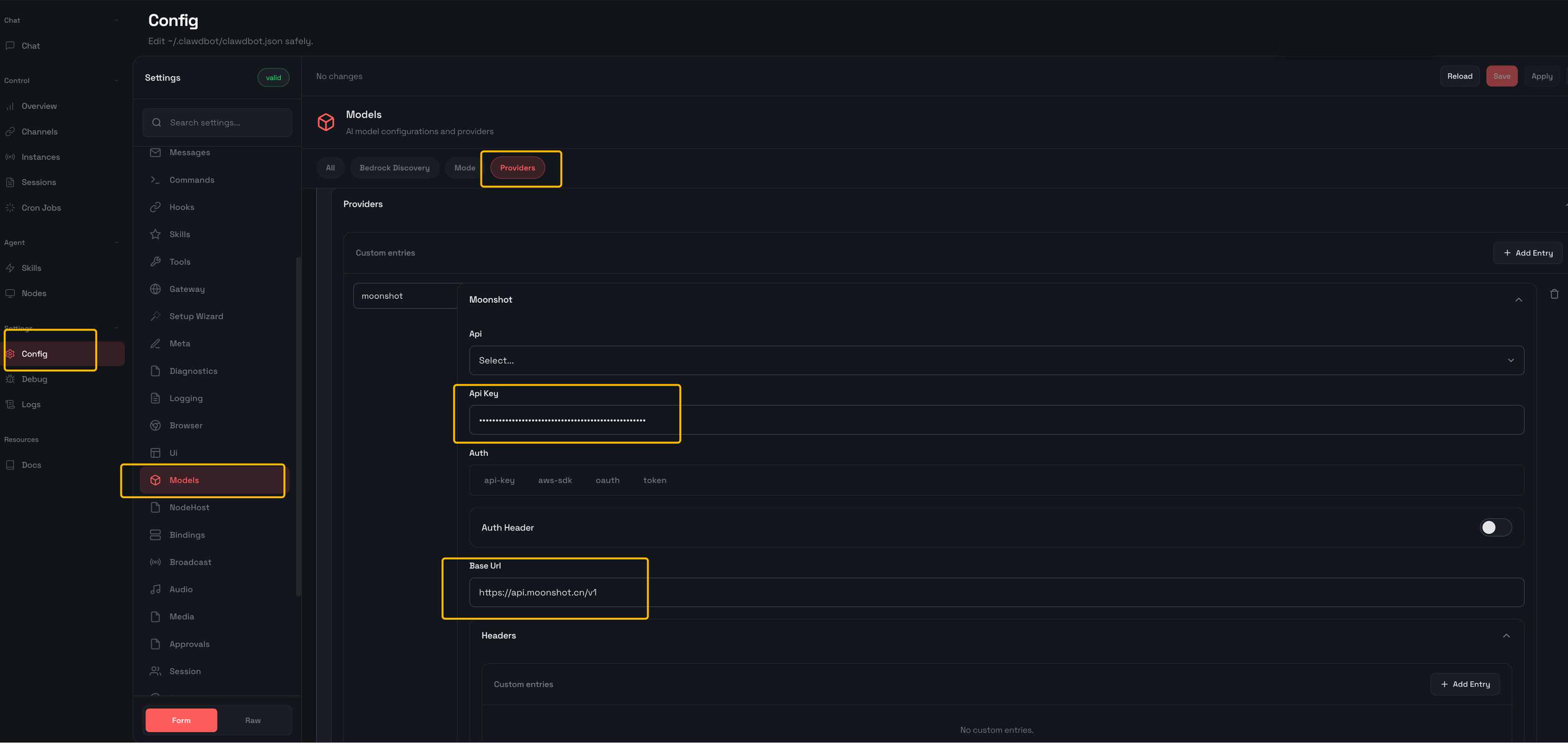 {"auth": {"profiles": {"moonshot:default": {"provider": "moonshot","mode": "api_key"}}},"models": {"mode": "merge","providers": {"moonshot": {"baseUrl": "https://api.moonshot.cn/v1","apiKey": "YOUR_API_KEY","api": "openai-completions","models": [{"id": "kimi-k2-0905-preview","name": "Kimi K2 0905 Preview","reasoning": false,"input": ["text"],"cost": {"input": 0,"output": 0,"cacheRead": 0,"cacheWrite": 0},"contextWindow": 256000,"maxTokens": 8192}]}}},"agents": {"defaults": {"model": {"primary": "moonshot/kimi-k2-0905-preview"},"models": {"moonshot/kimi-k2-0905-preview": {"alias": "Kimi K2"}},"workspace": "/YOUR_WORK_SPACE","maxConcurrent": 4,"subagents": {"maxConcurrent": 8}}}}