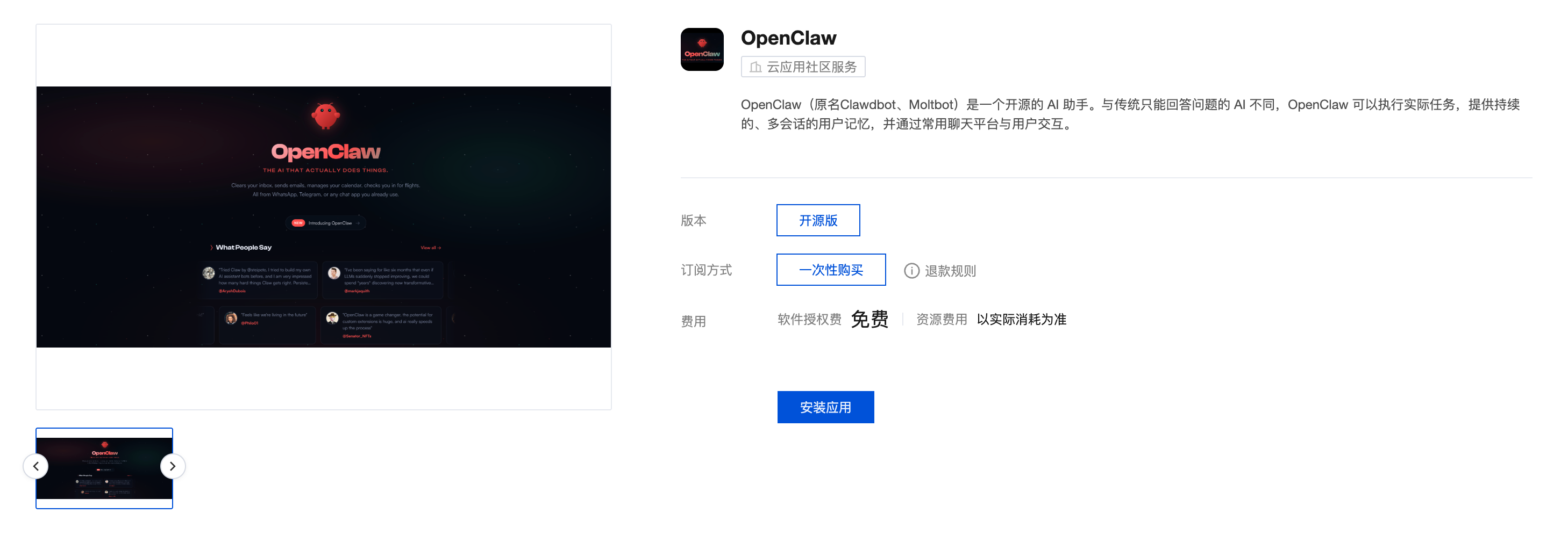 Openclaw 来自开源社区,云应用不收费。云资源部分包含云服务器和 DeepSeek API,按照实际消耗计费。