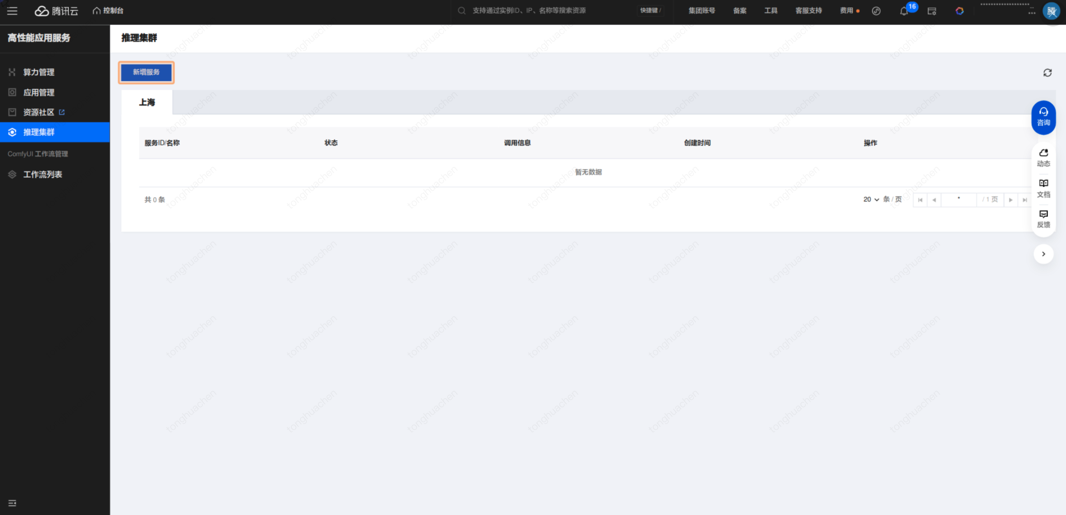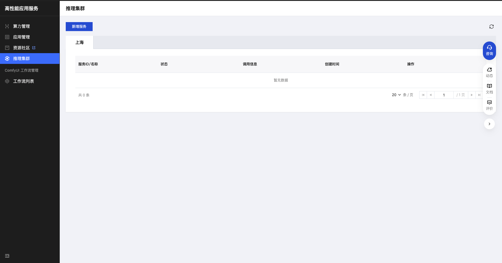 2. 创建推理集群,新增服务按钮位于推理集群管理页面的左上角,单击后可启动服务创建流程,支持从已有模型或镜像创建推理服务实例。