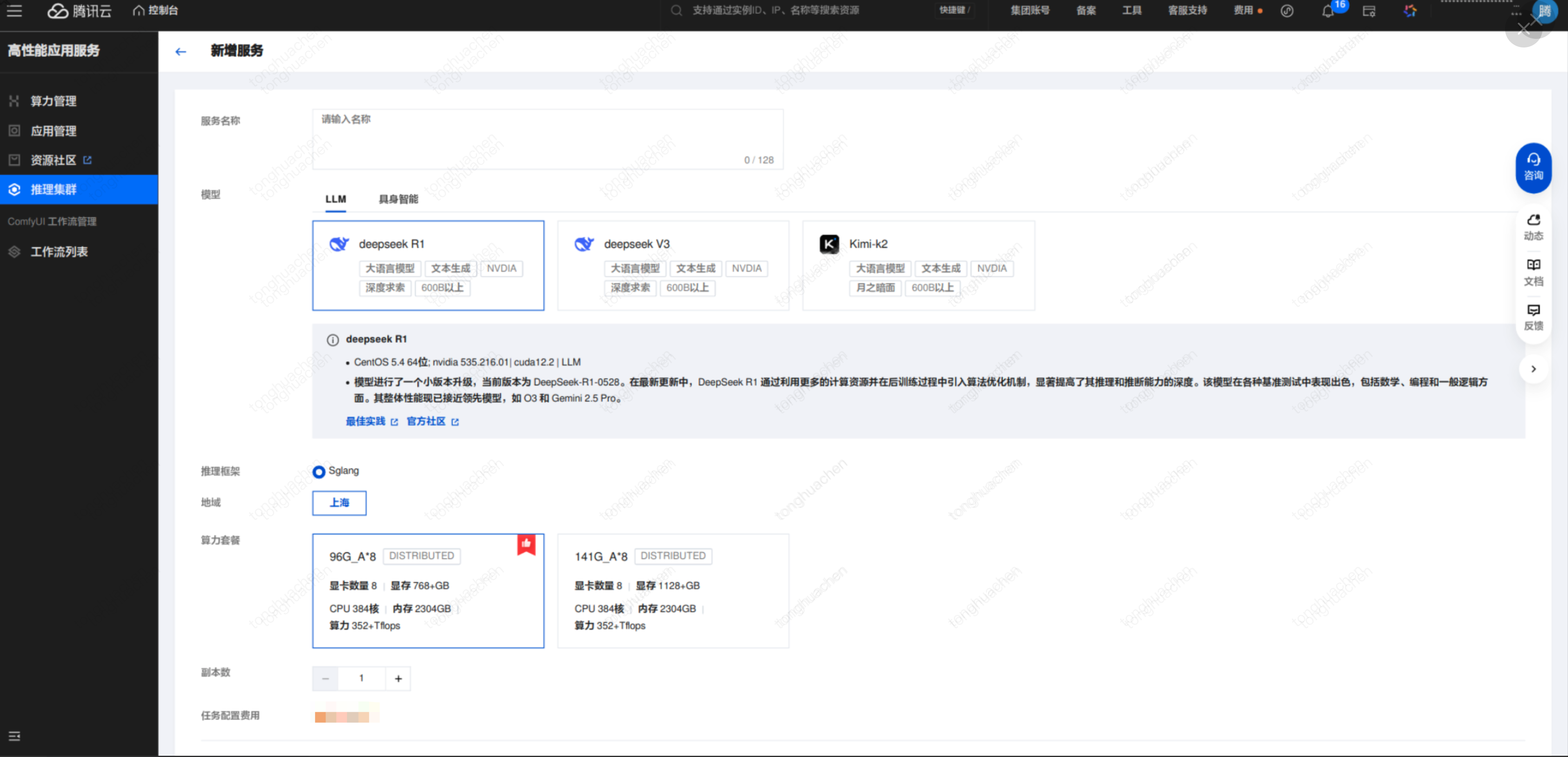 HAI 推理集群是专为高性能、低延迟、高并发的 AI 模型线上服务设计的基础设施,广泛应用于需要将训练完成的大语言模型(LLM)、视觉模型、多模态模型等部署为生产级服务的场景。本文详细介绍如何在 HAI 高性能应用服务中创建推理集群,涵盖操作流程、参数配置说明及注意事项,帮助您快速完成集群部署并用于模型推理服务。