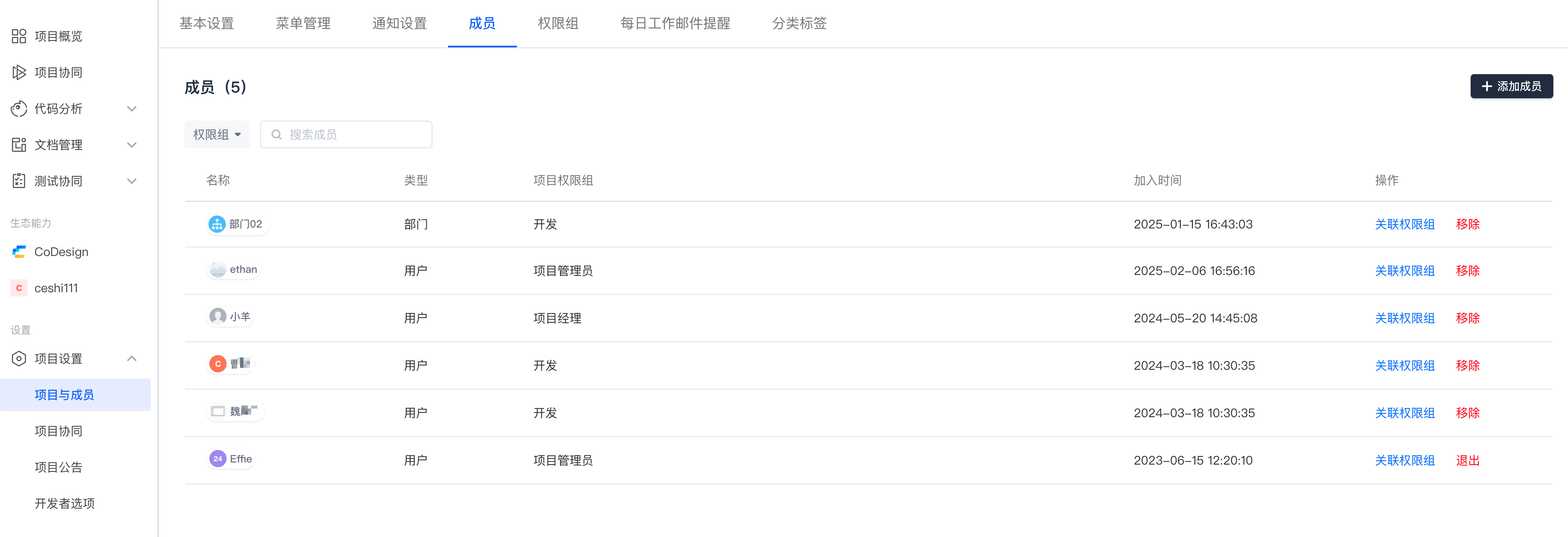 在一个项目内,拥有成员管理项目权限的成员可以添加成员、移除成员;拥有成员权限配置项目权限的成员可以修改成员的关联项目权限组。