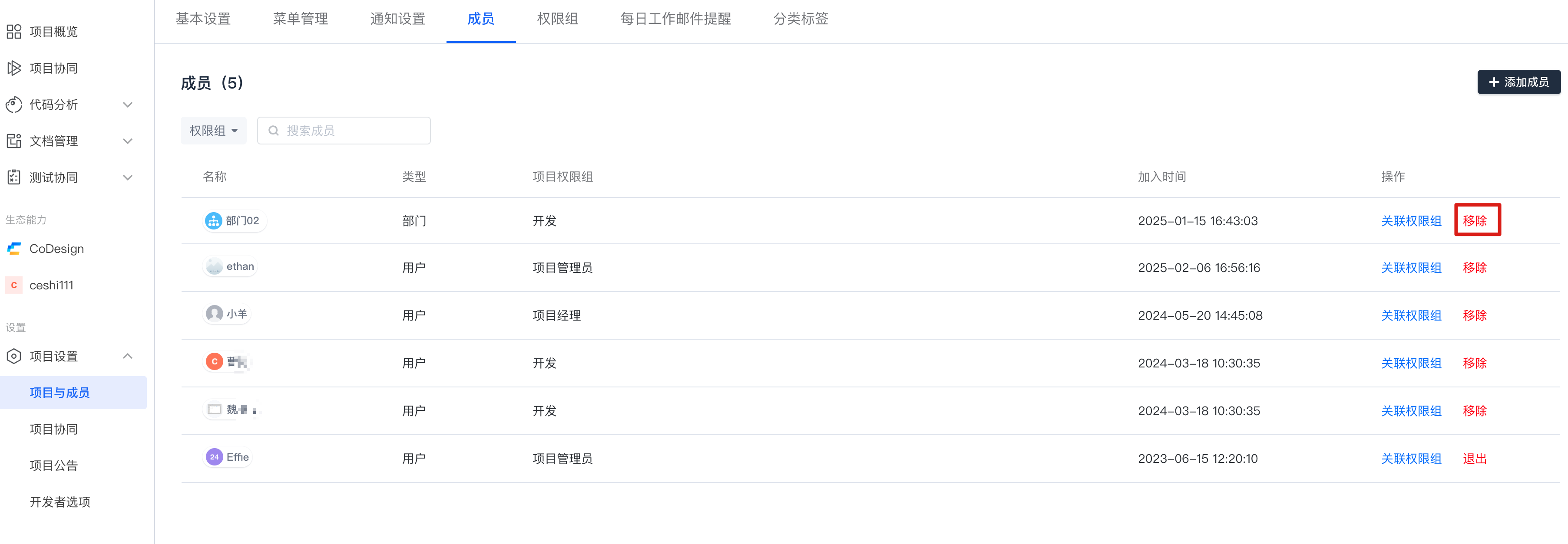 在项目设置 > 项目与成员 > 成员中, 单击移除即可将指定用户、用户组或部门移出项目。