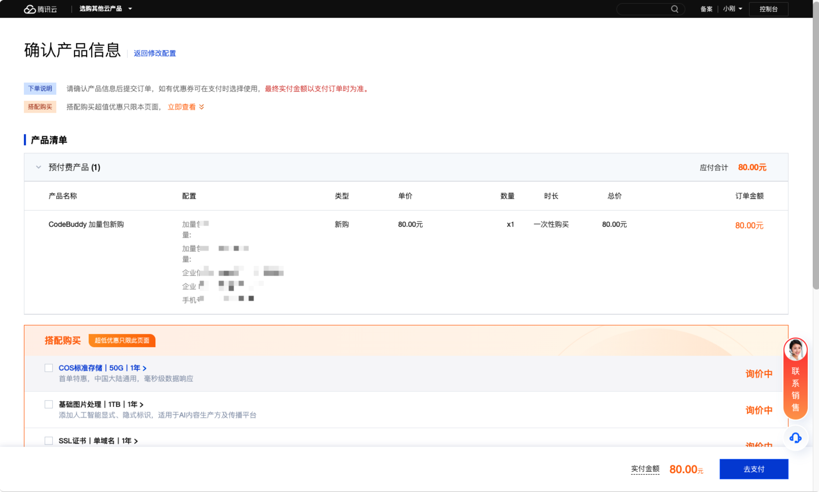 3. 单击立即购买确认订单信息。