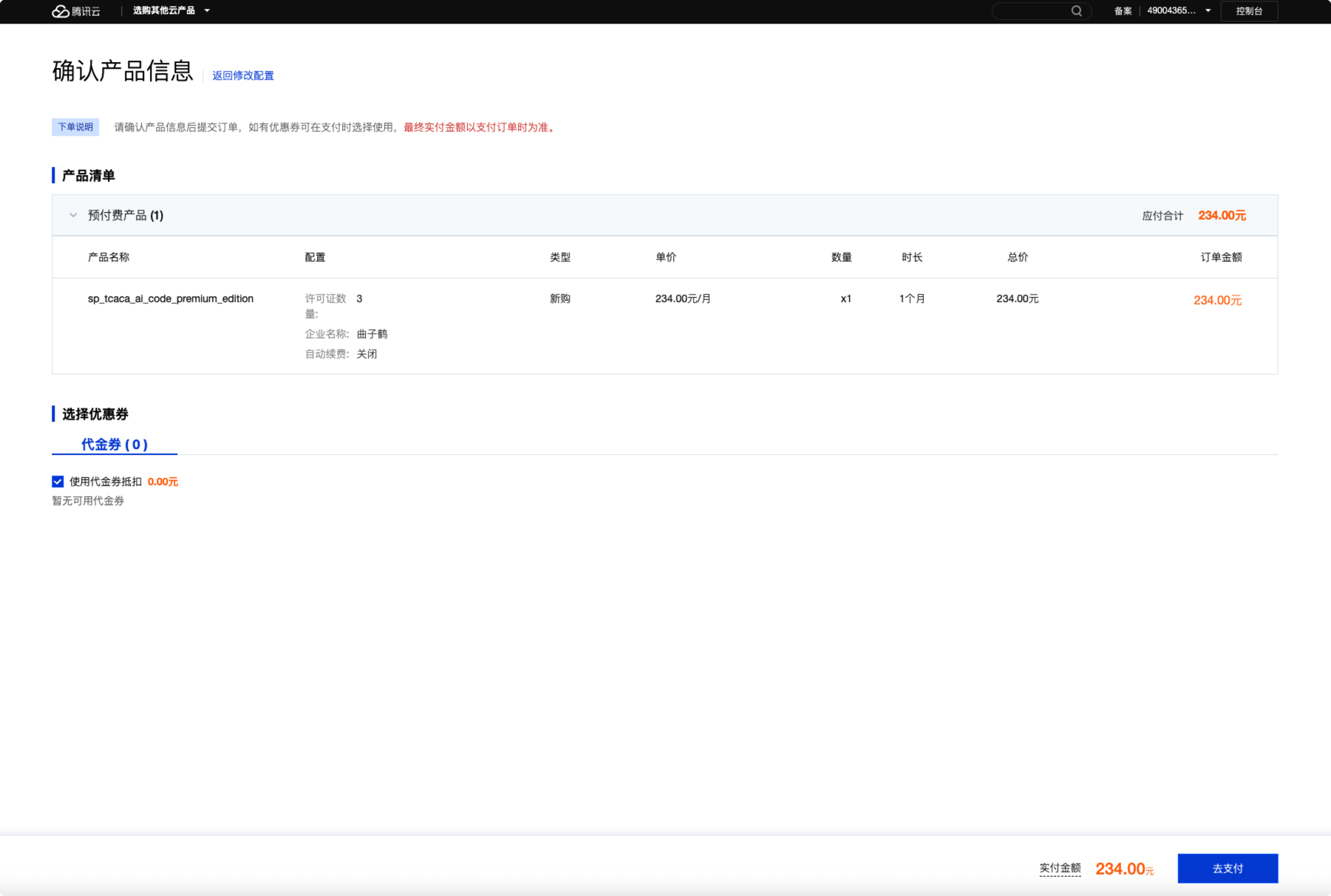 6. 单击立即购买确认订单信息。