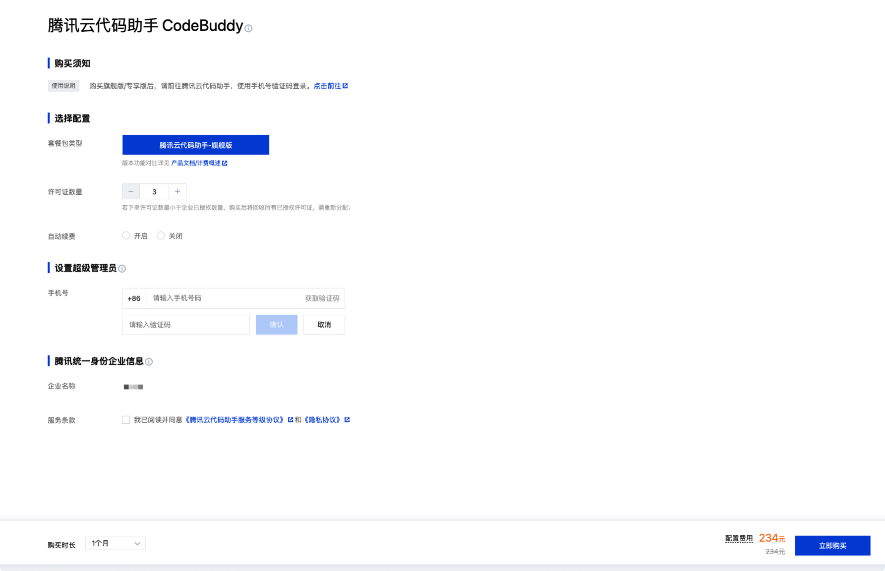 3. 选择企业,CodeBuddy 旗舰版将使用腾讯统一身份作为企业成员与组织管理平台,您可以选择已创建过的腾讯统一身份企业,若未创建过,购买后将为您自动创建。