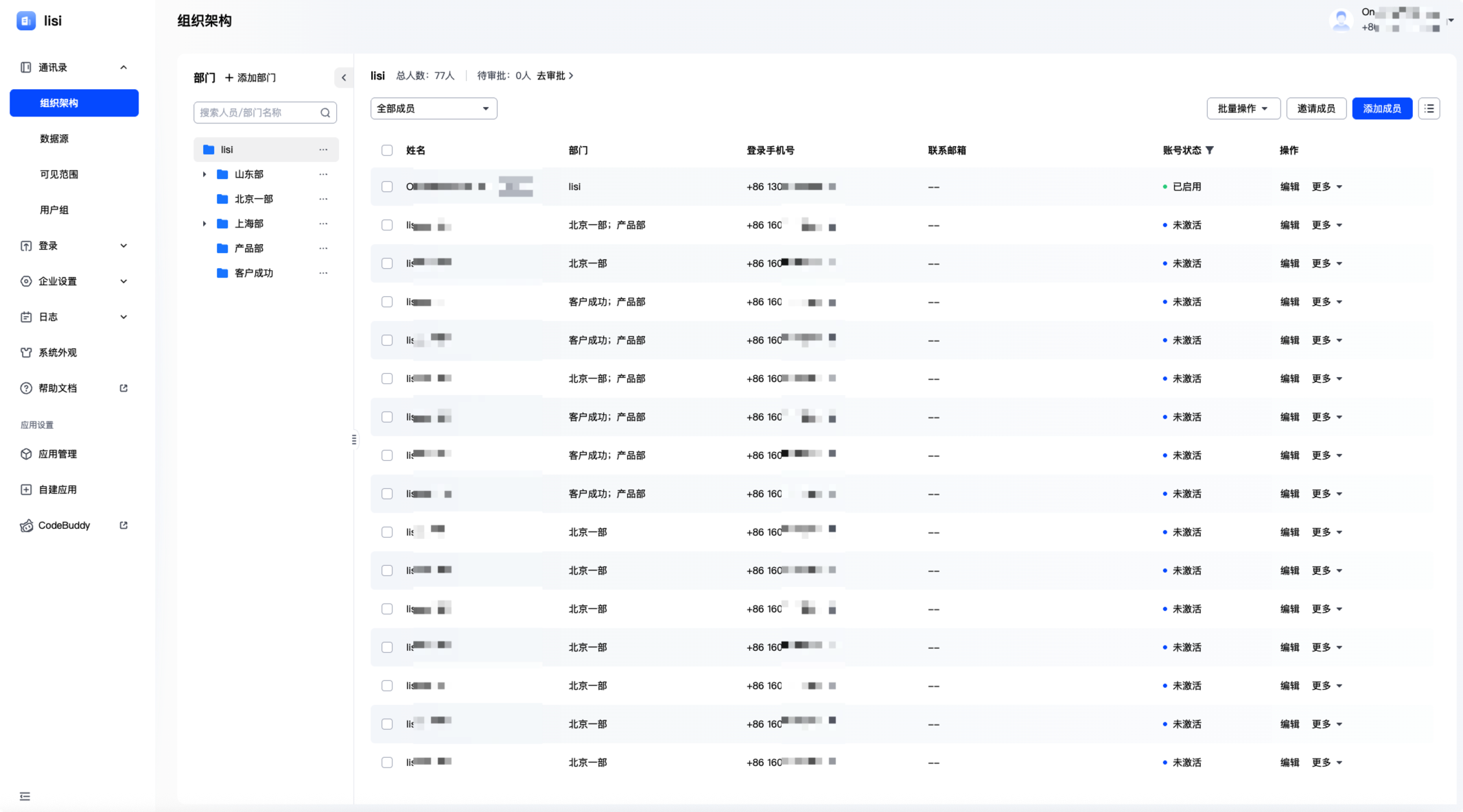 2. 登录成功后,成员信息将同步至 CodeBuddy 企业管理后台。