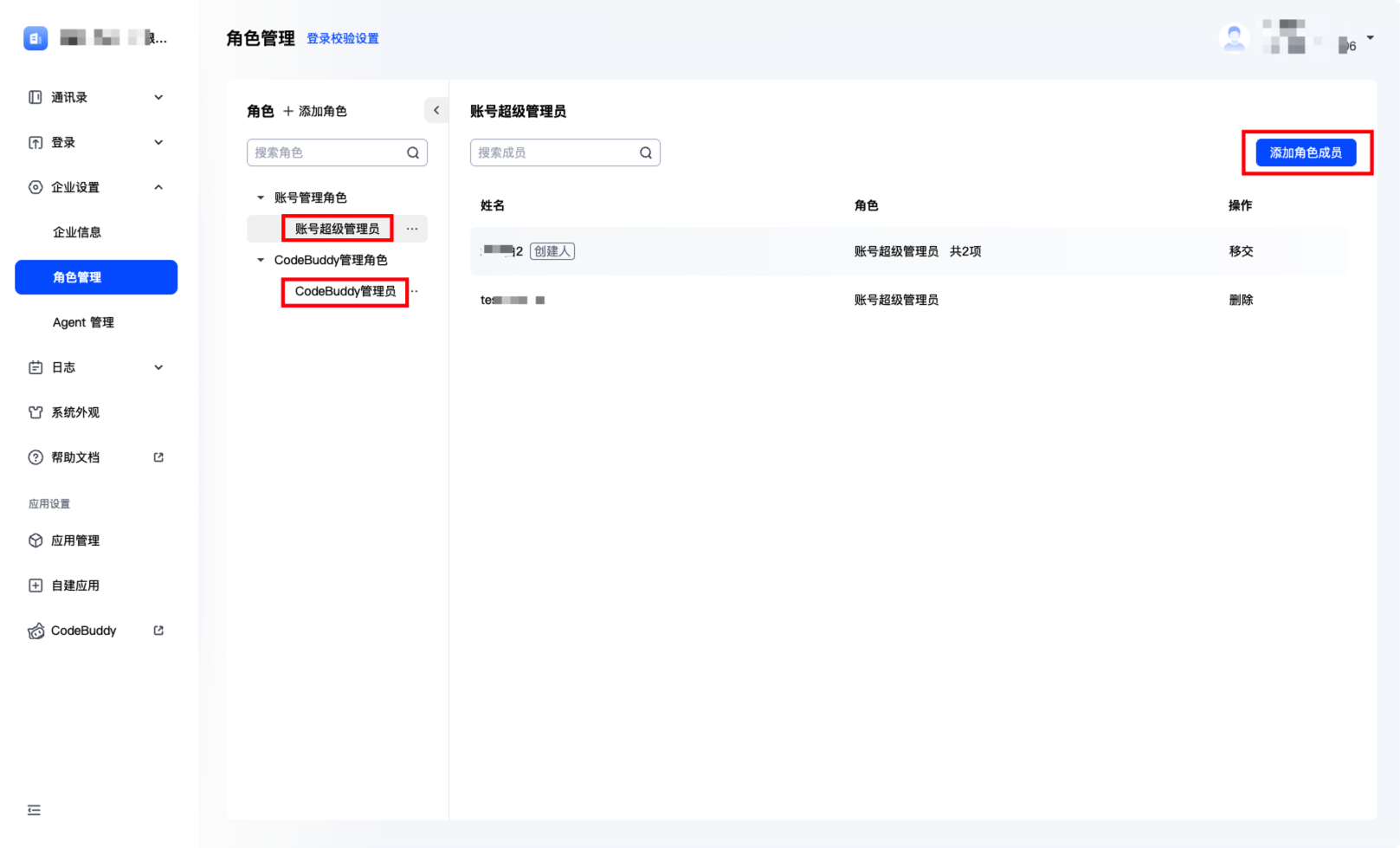 2. 在腾讯统一身份后台当中,选择 企业设置/角色管理,在 账号超级管理员 和 CodeBuddy管理员 两个角色下分别添加需要管理企业通讯录的成员。