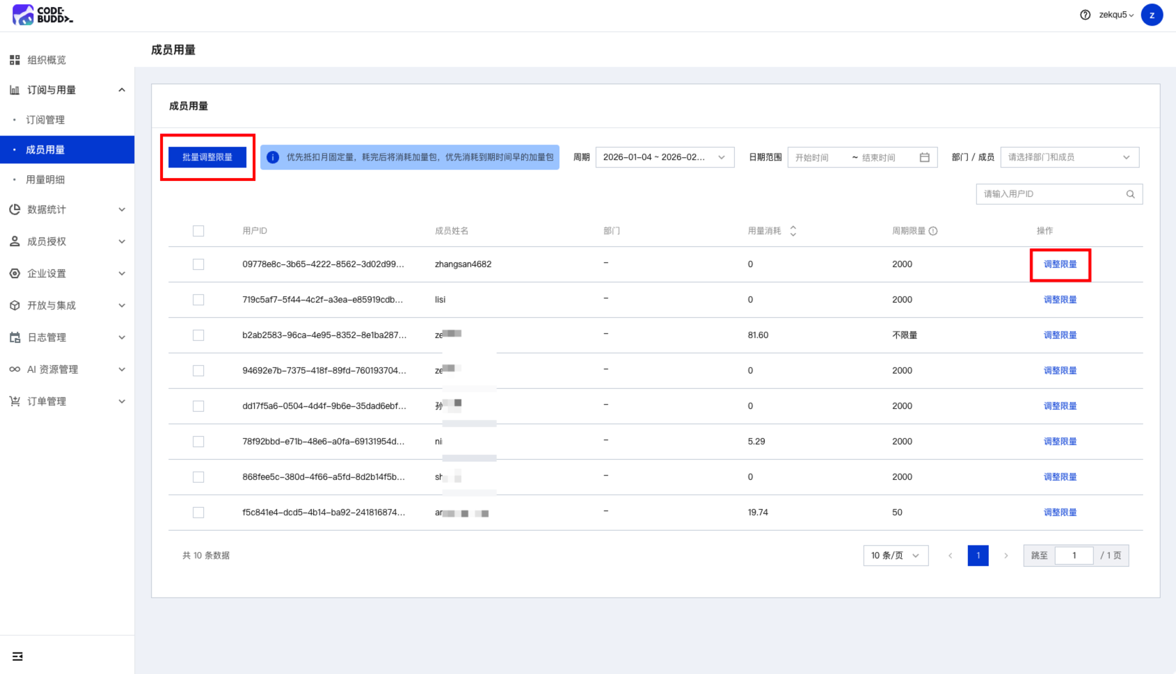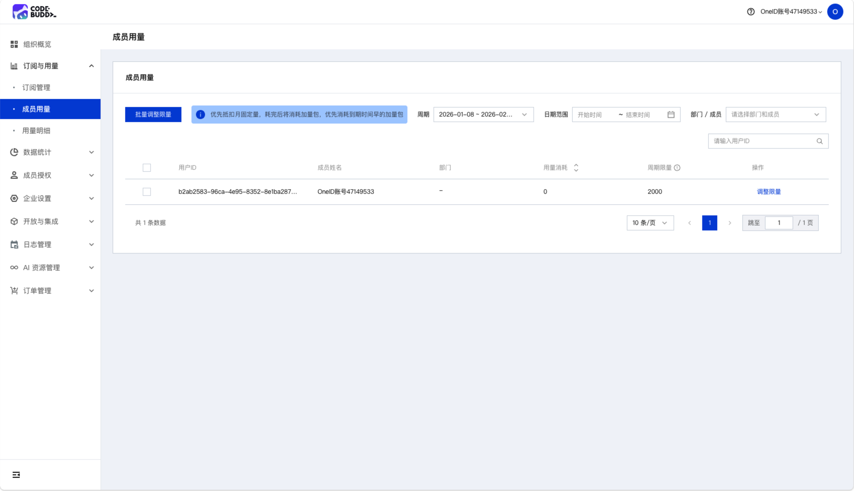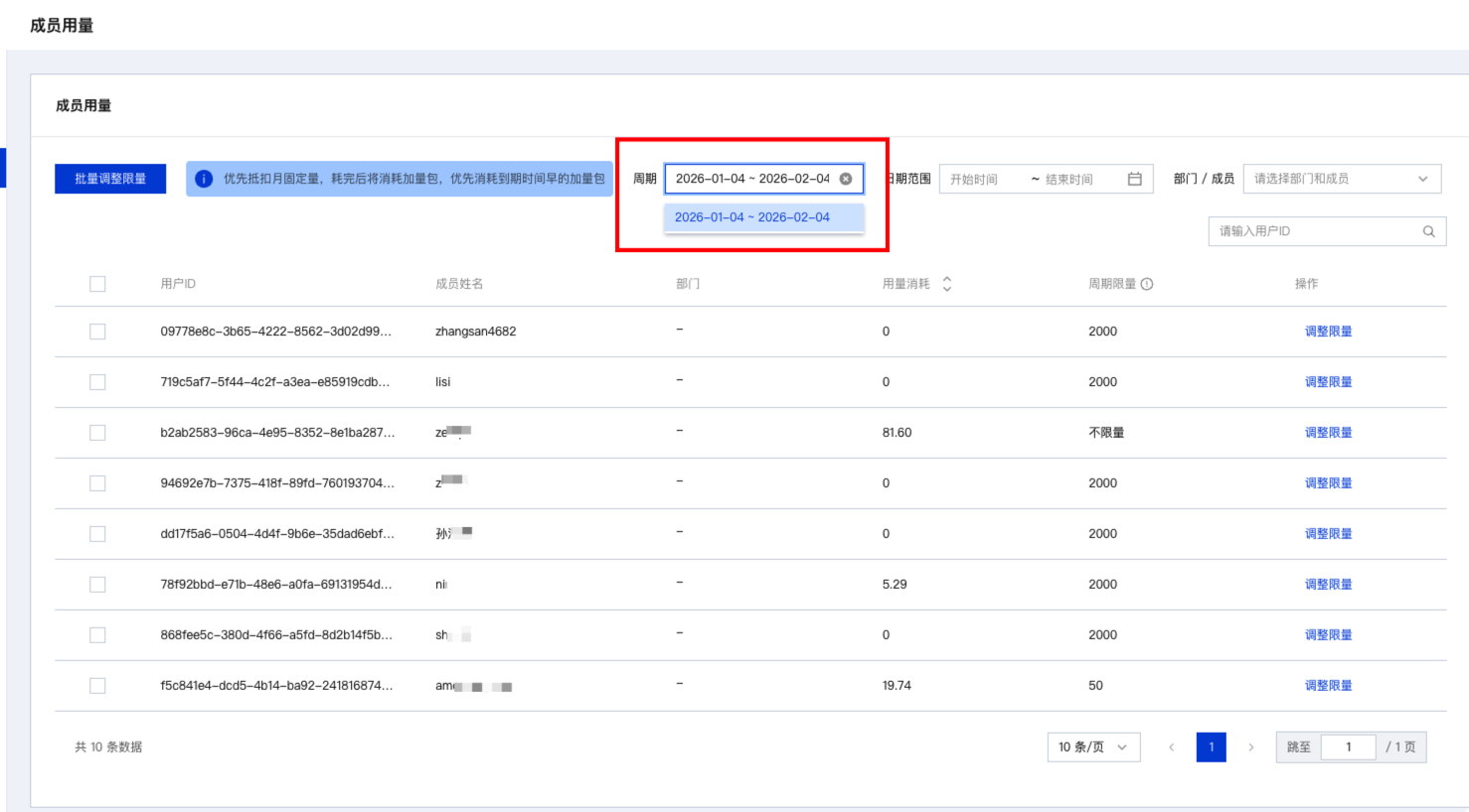 用量管理以月为周期,可以筛选不同的周期,查看成员在周期内的用量消耗情况。
