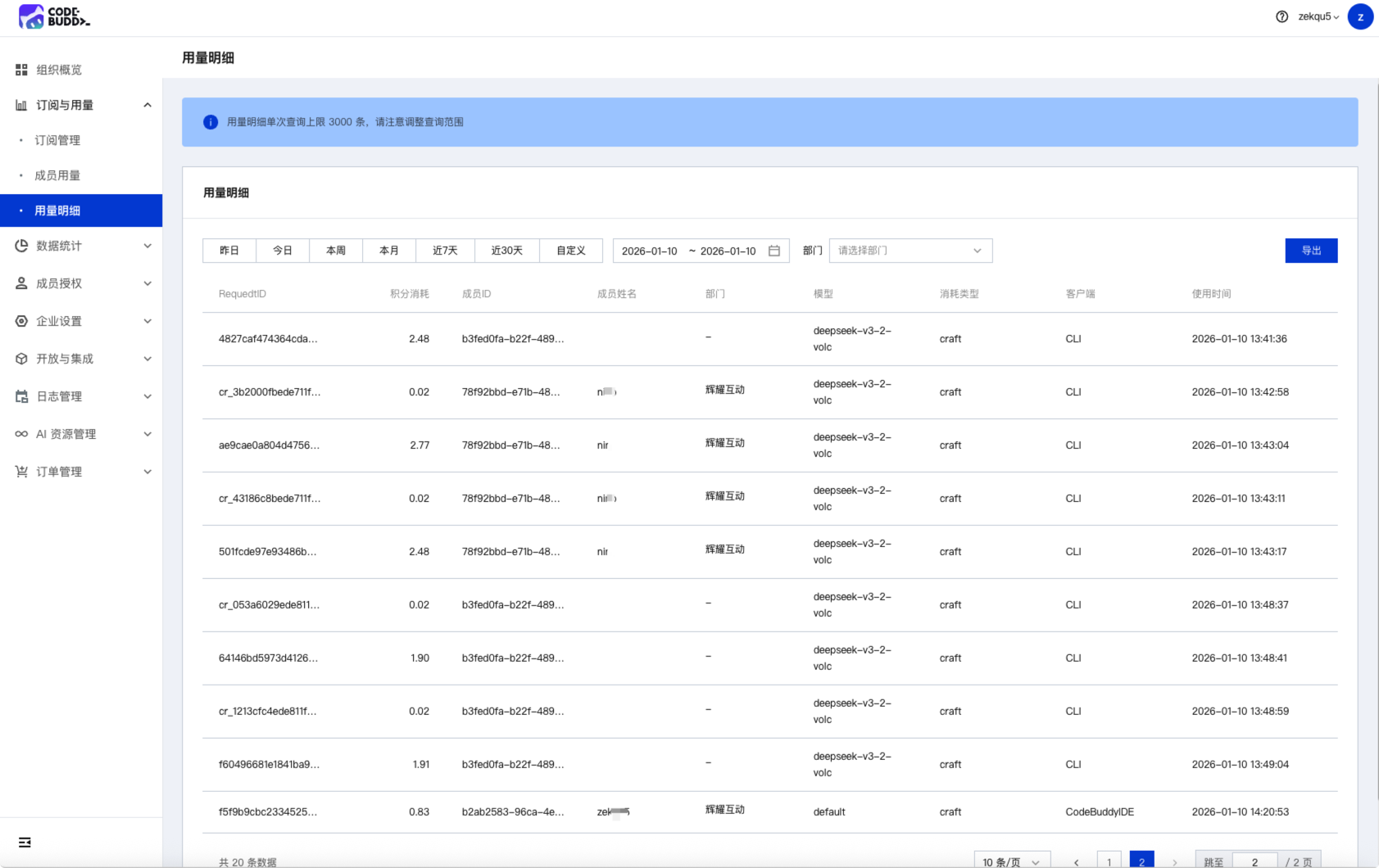 https://<企业id>.copilot.qq.com/admin/usage/detail,可以查看到企业所有用量的历史流水信息。流水信息以对话为维度,每次对话记录为一次 Request,能够查看每次对话产生的用量消耗,注意用量明细单次查询上限 3000 条。