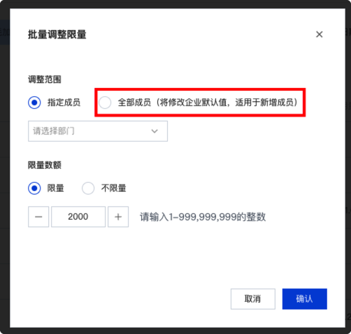 若选择调整全部成员,将同步调整企业默认值,除了修改当前企业内的所有成员外,新增成员也同样适用该用量。