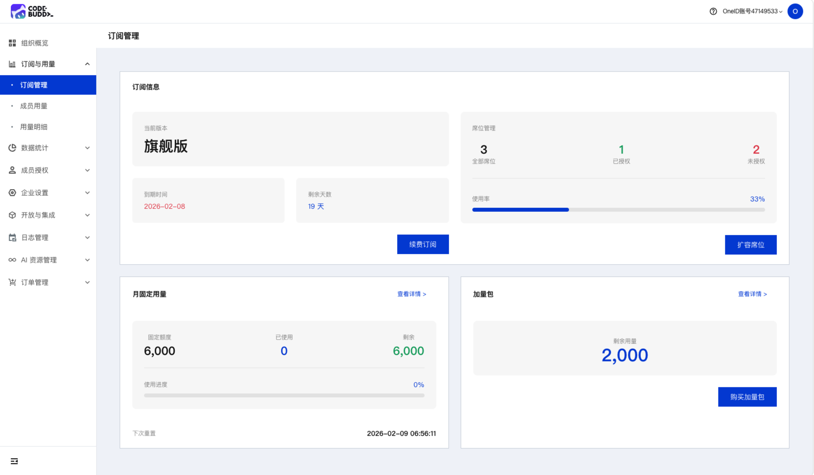 https://<企业id>.copilot.qq.com/admin/usage/subscription,可以查看到企业的订阅信息,包括订阅版本、席位情况、月固定用量情况、以及加量包余量。