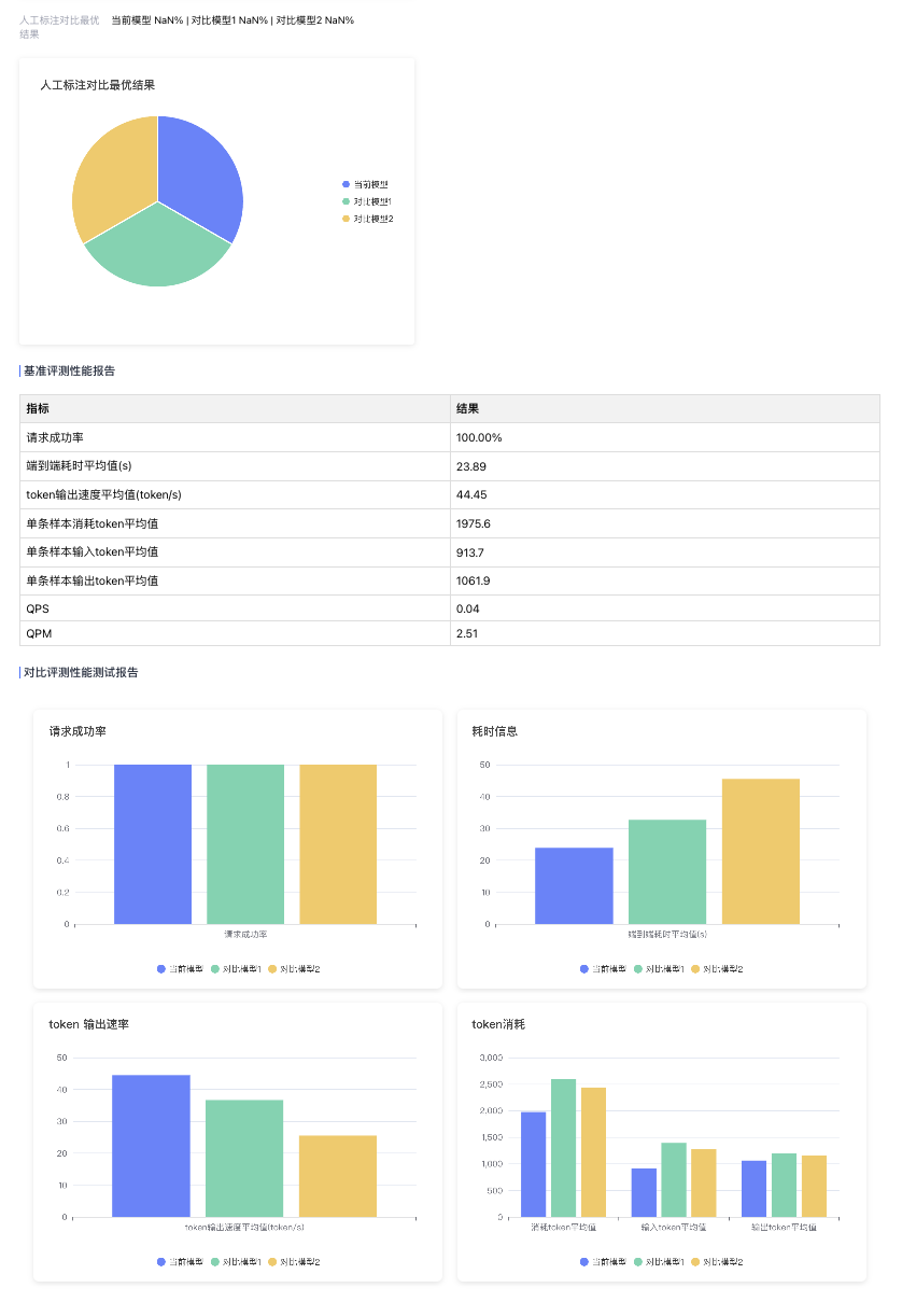 跑批完或评测完后可以查看报告,报告中包含基本信息、评测配置信息、基准评测结果、对比打分评测结果、基准评测性能报告、对比评测性能测试报告等内容并支持输出图表,将已有的测试结果数据进行可视化展示。