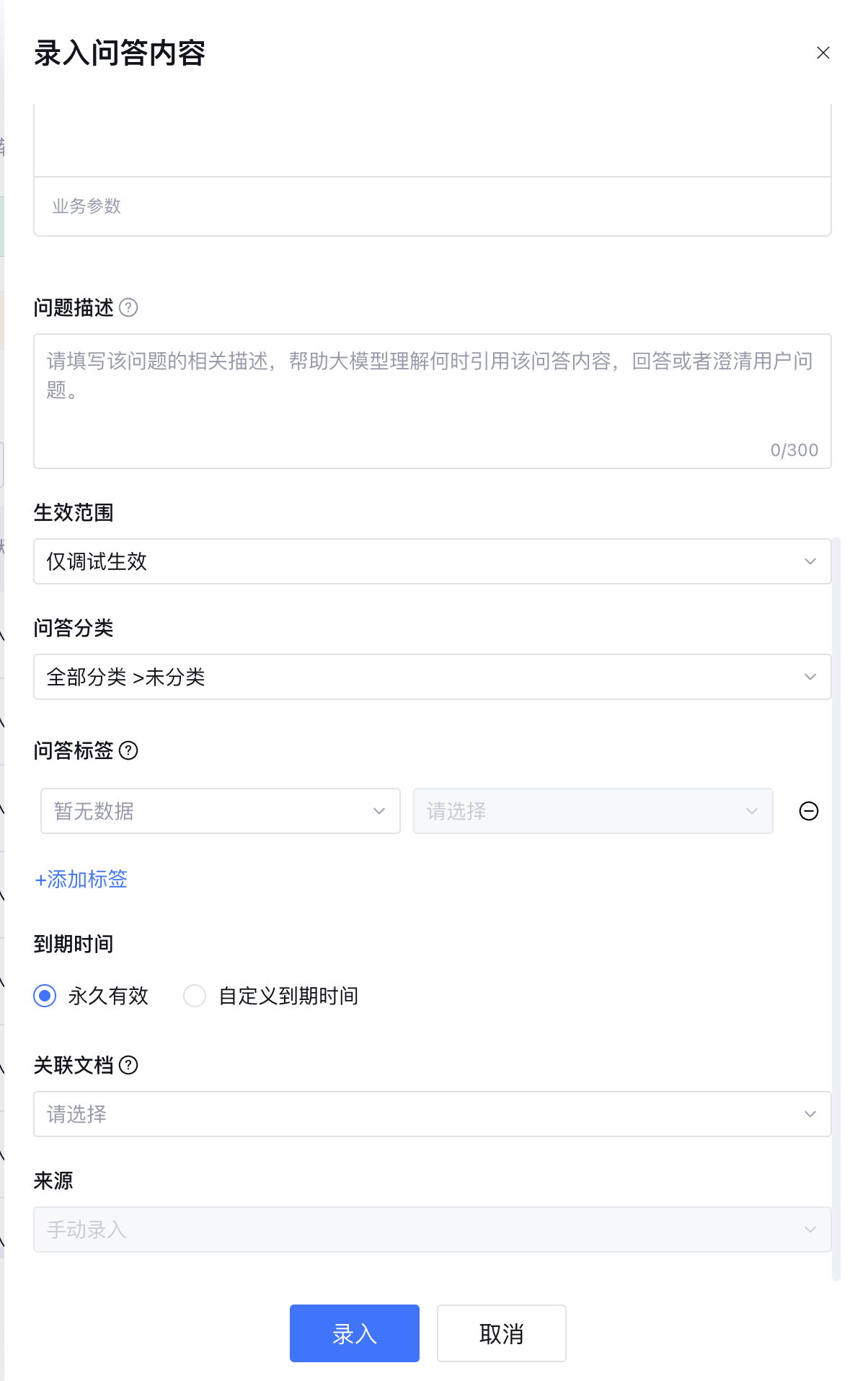 3. 在录入问答窗口完成问答内容输入后,其他设置请参见 问答设置,单击录入,完成问答录入。