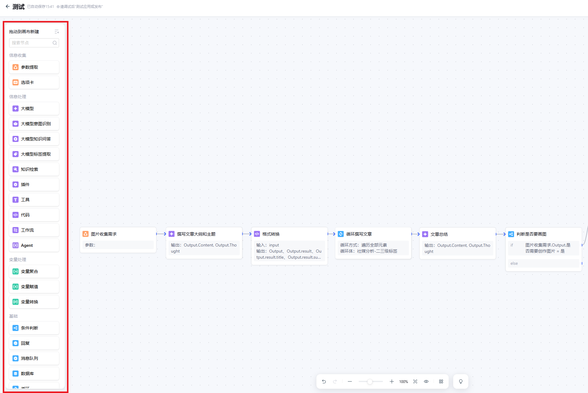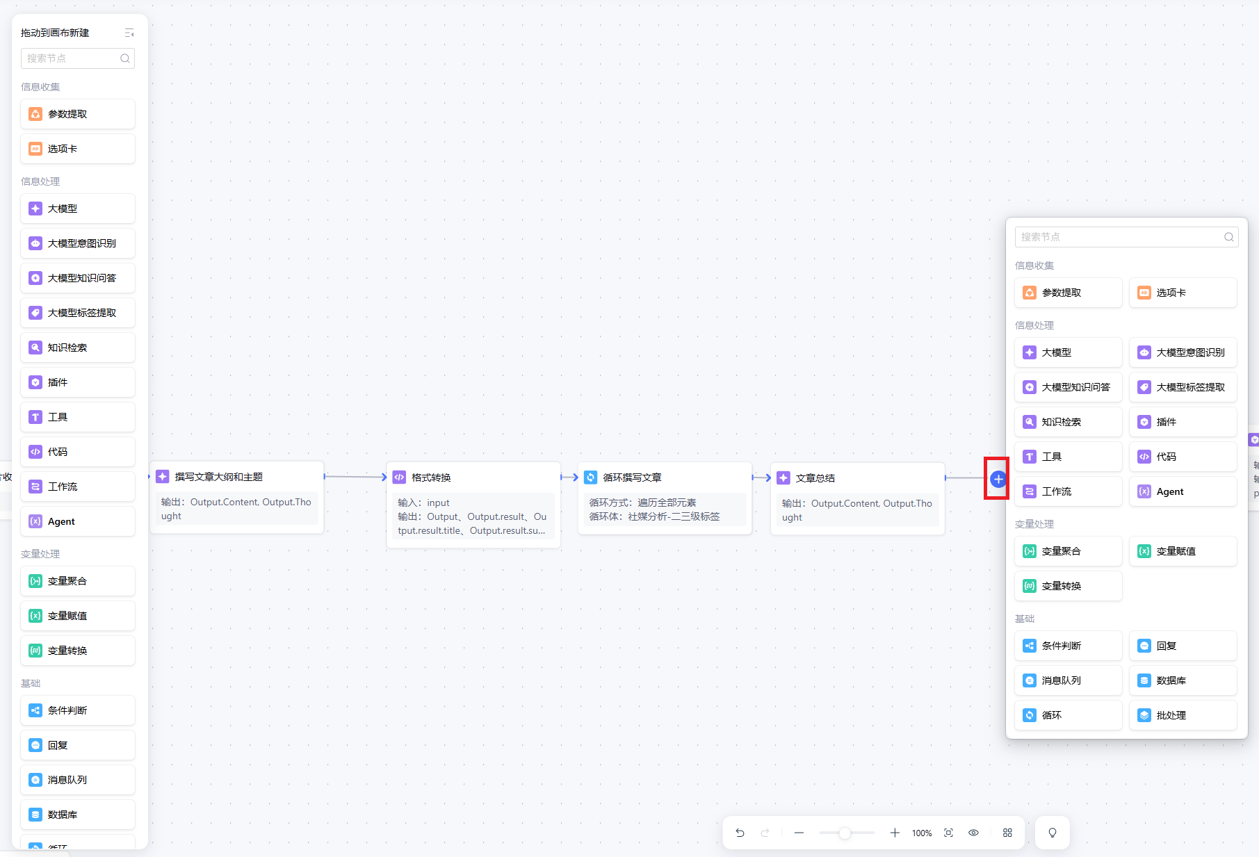 3. 根据您的业务需求对画布中的节点进行连线。节点之间的连线方式可以分为串行和并行连接两种,节点的输入变量可以引用所有祖先节点的输出变量。