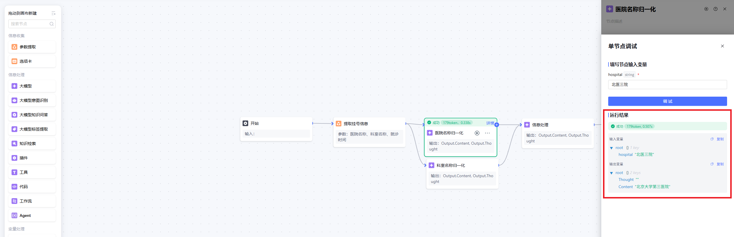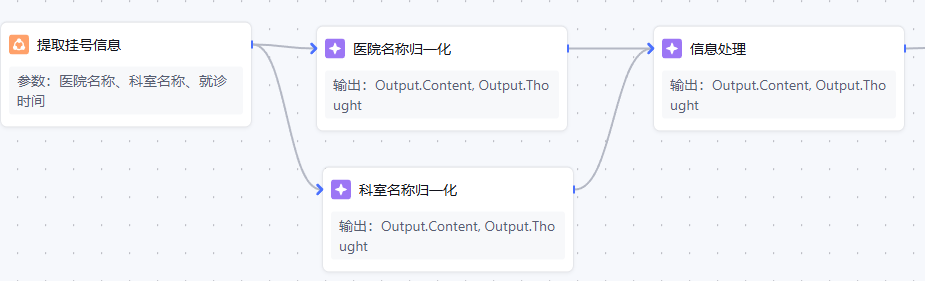 并行连接的示例:节点的输入或输出连接多条连线。例如下图中的“医院名称归一化”节点和“科室名称归一化”节点就是并行连接。