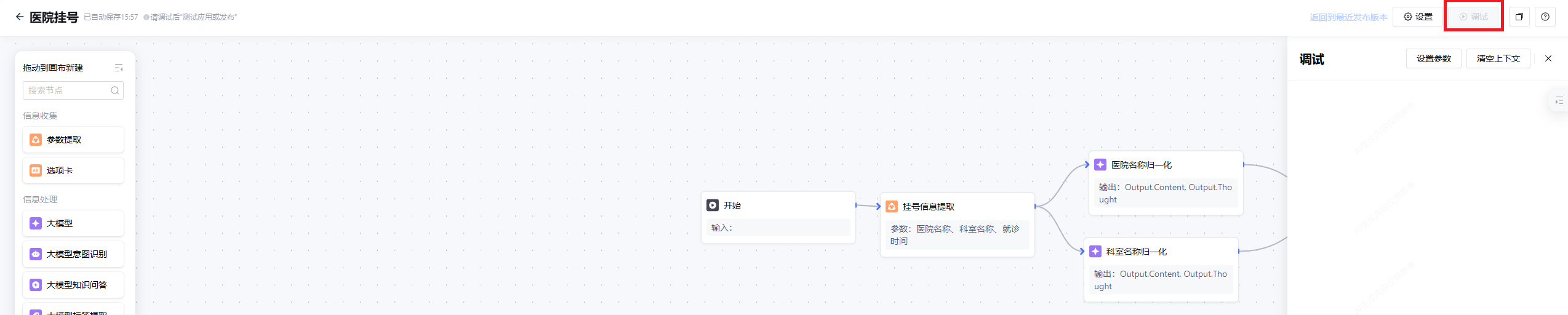 1.1 配置完成后,单击页面右上角的调试,即可进入工作流的端到端调试页面。