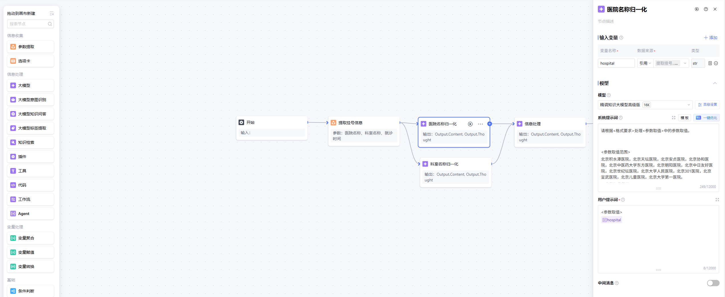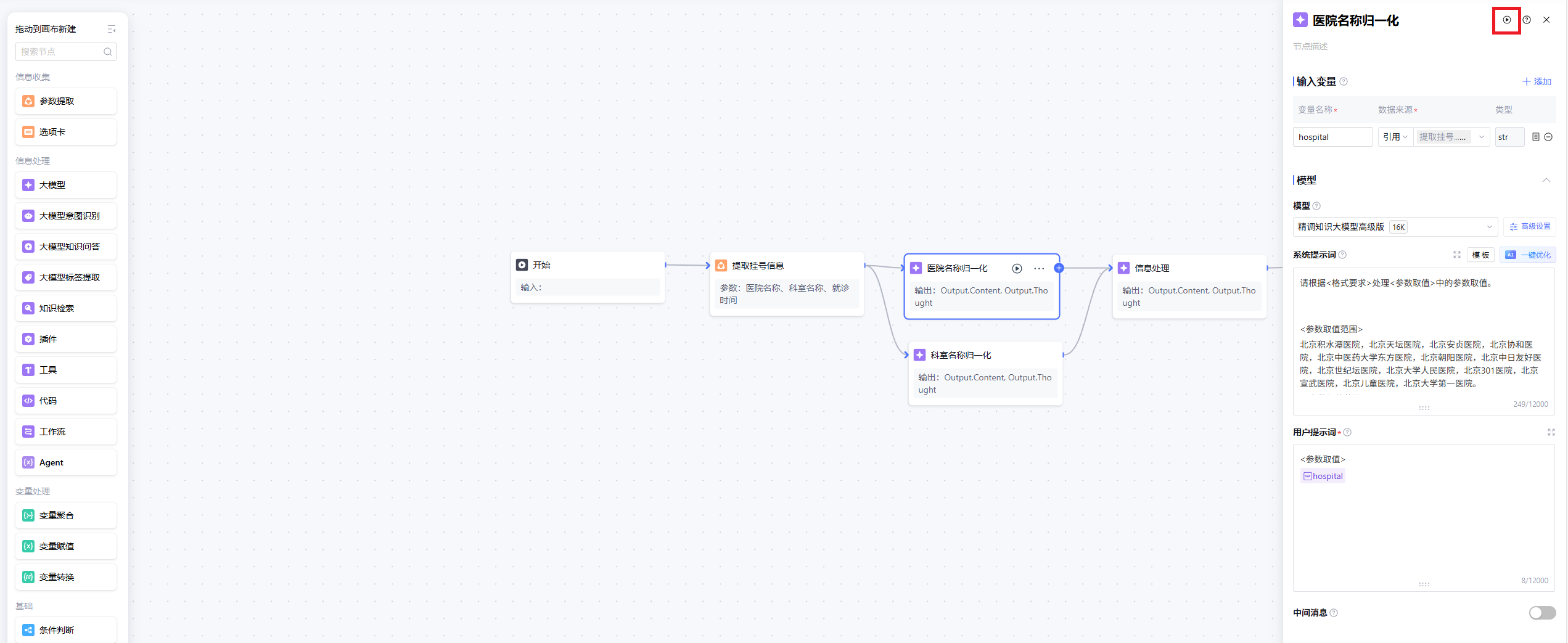 4. 单击画布中的节点,页面右侧会侧滑出节点的详细配置页面,在其中对该节点的输入变量、处理过程和输出变量进行设置。用户可根据需要进行异常处理设置,详见各节点的说明文档。