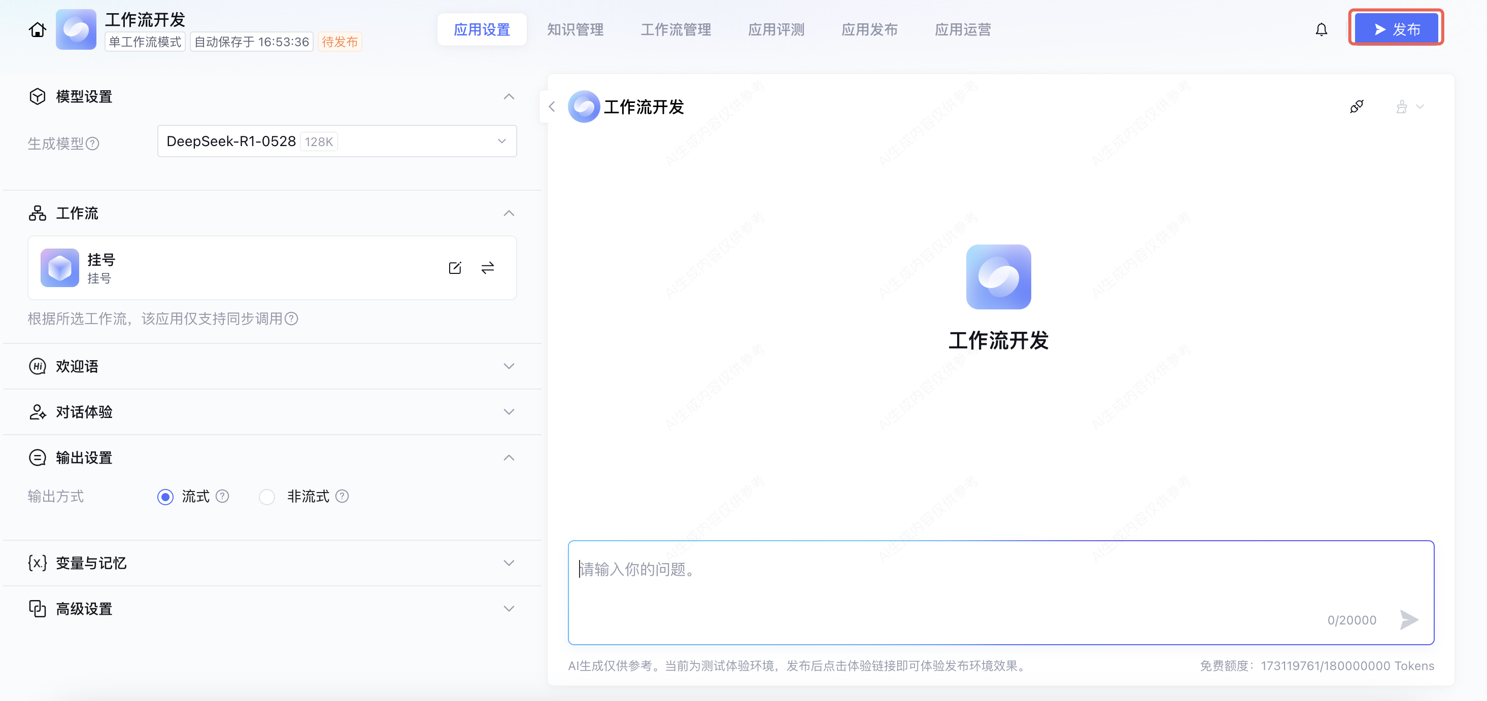 3. 如果测试结果符合您的业务需求,则可以通过单击应用页面右上角的发布,将该应用发布上线,在生产环境中使用。