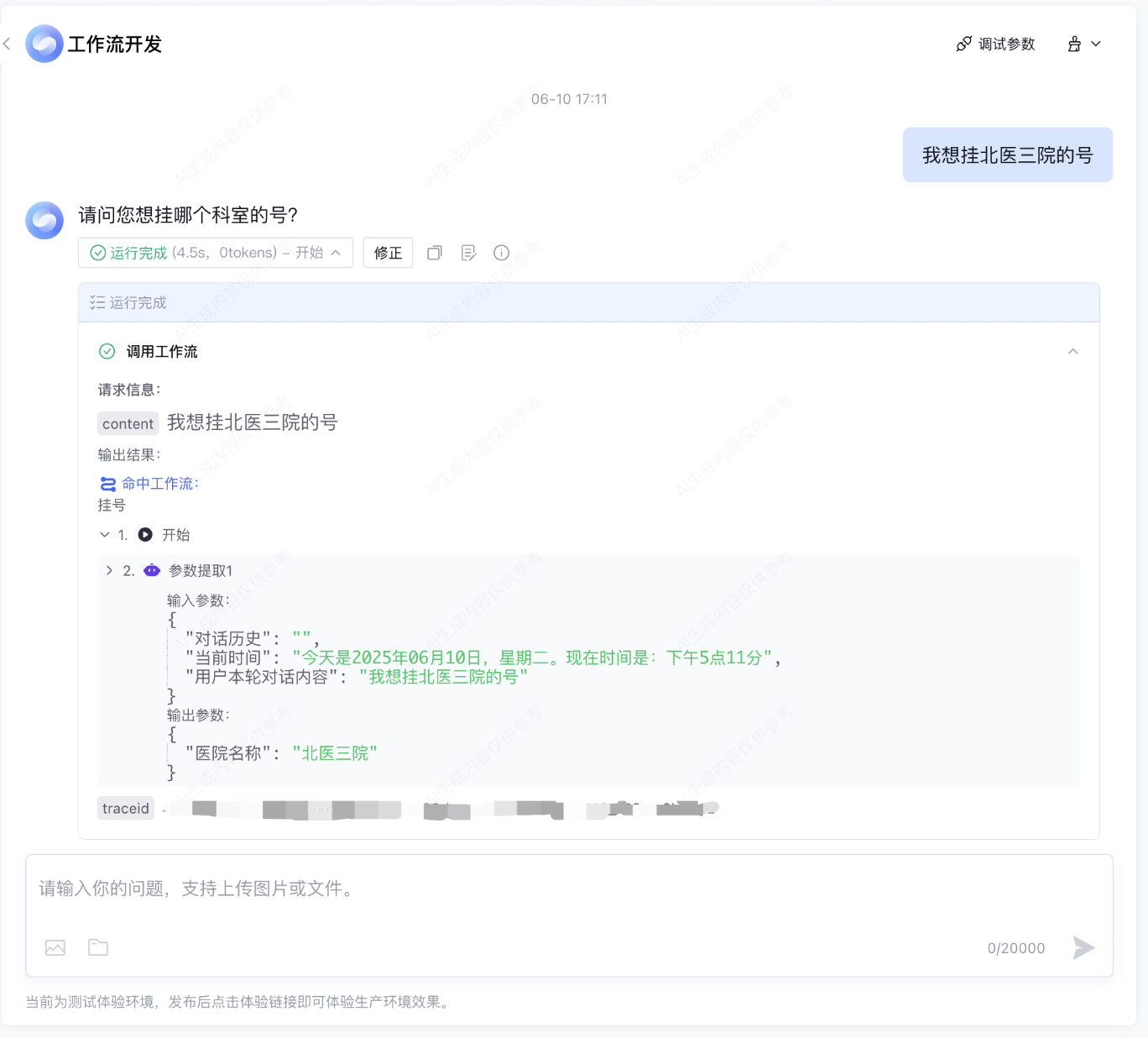 1.2 在调试页面的输入框中输入您的测试内容,并通过回车键或点击发送来发送该信息,系统将根据您发送的内容运行工作流并输出结果。