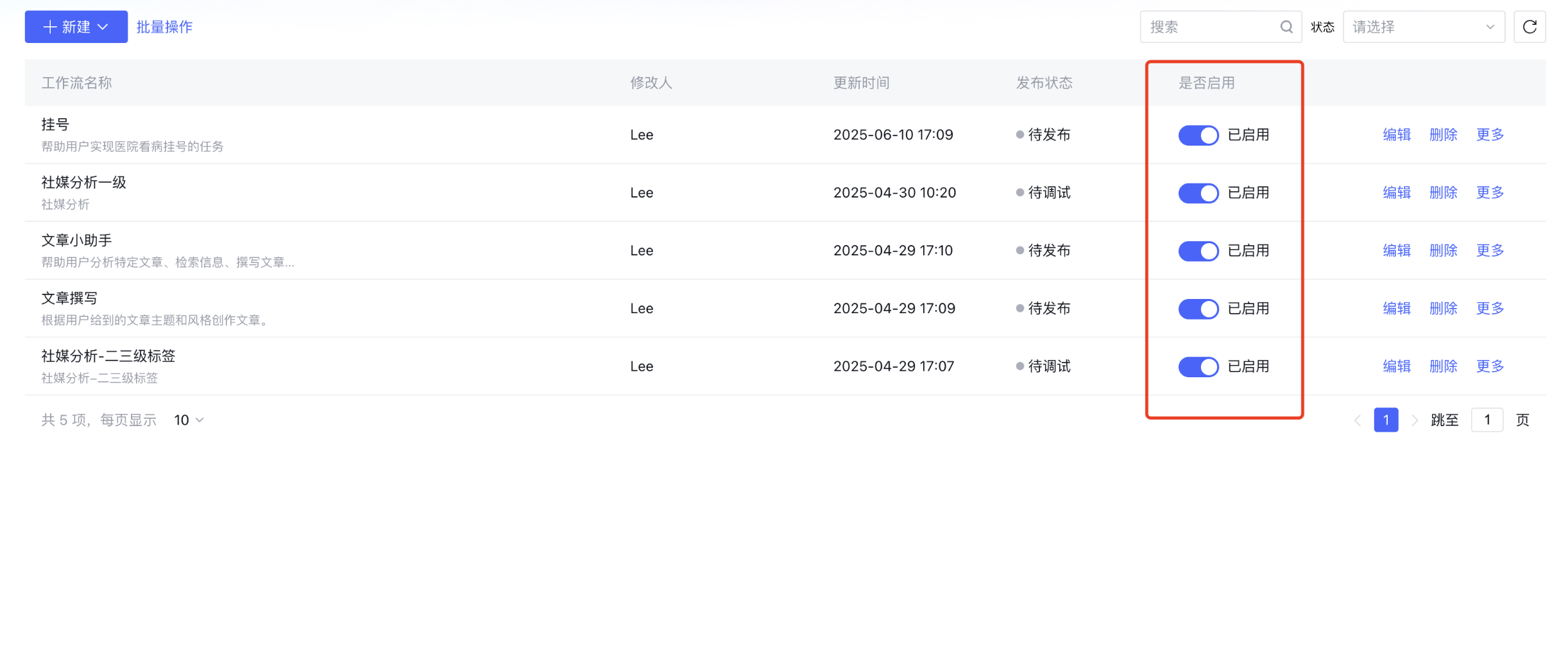 1. 当您完成对工作流的配置后,返回到工作流管理页面启用或者停用该工作流。