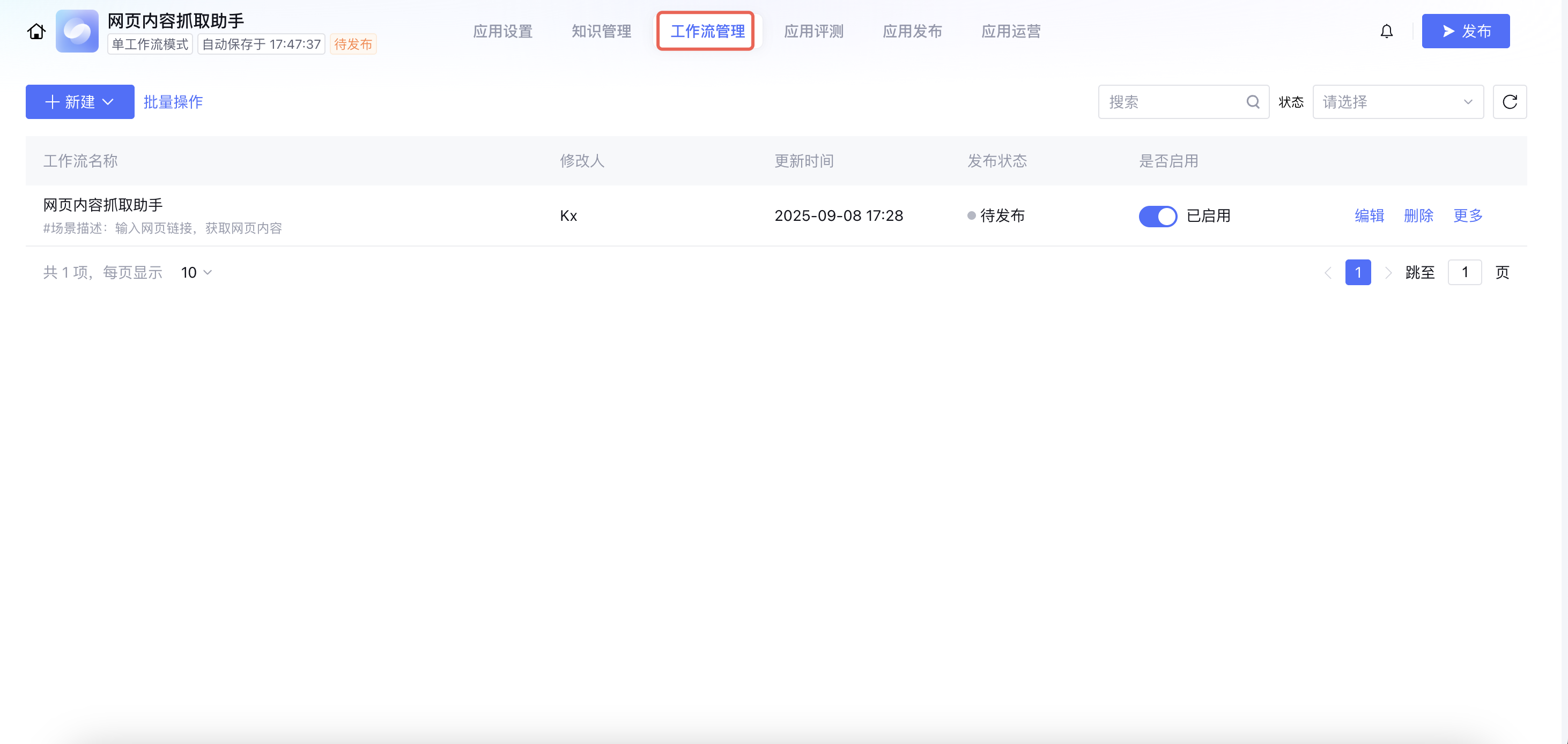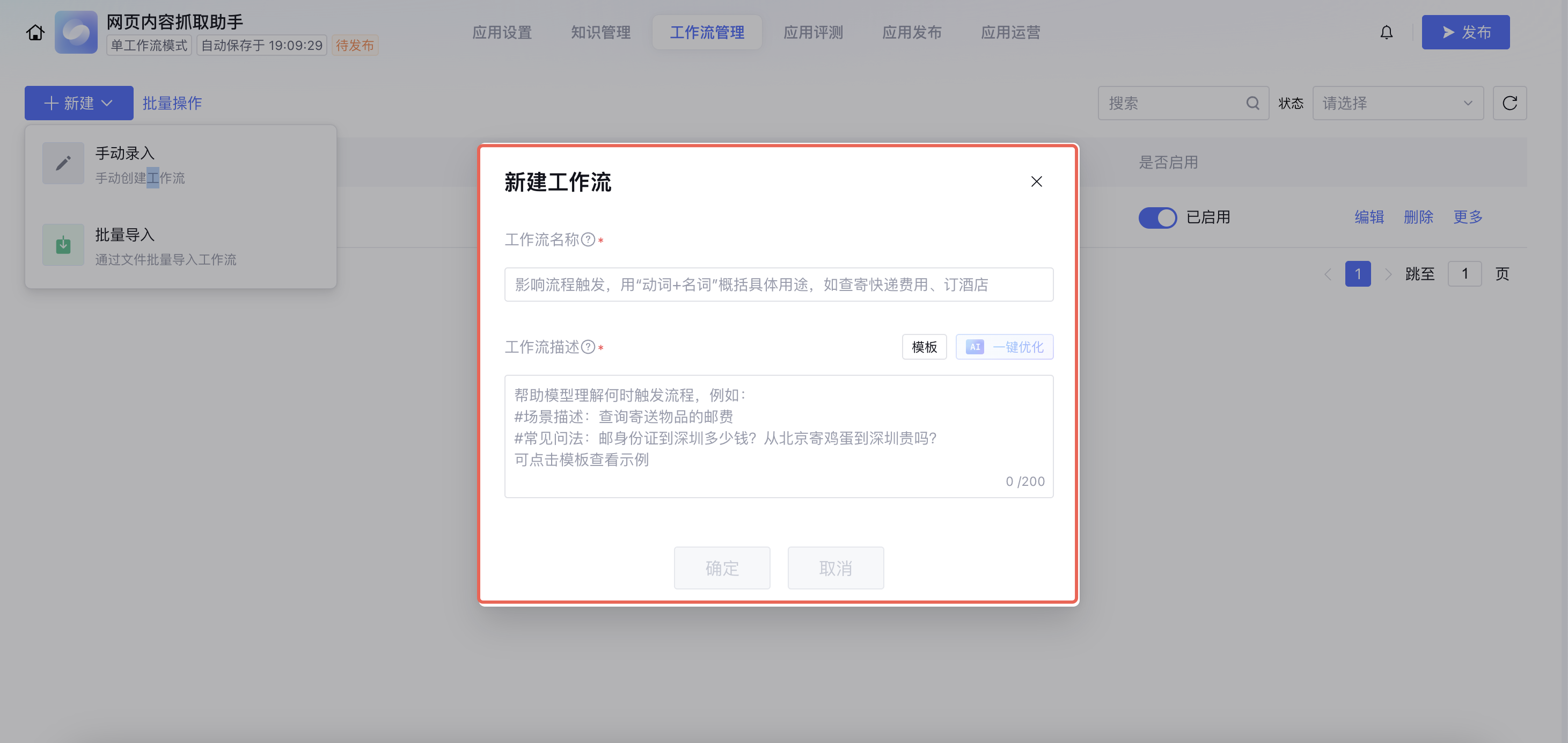 进入应用详情页面,单击页面上方的工作流管理切换到工作流页面。该页面支持工作流的新建、配置、启用、删除、导入导出等管理功能。