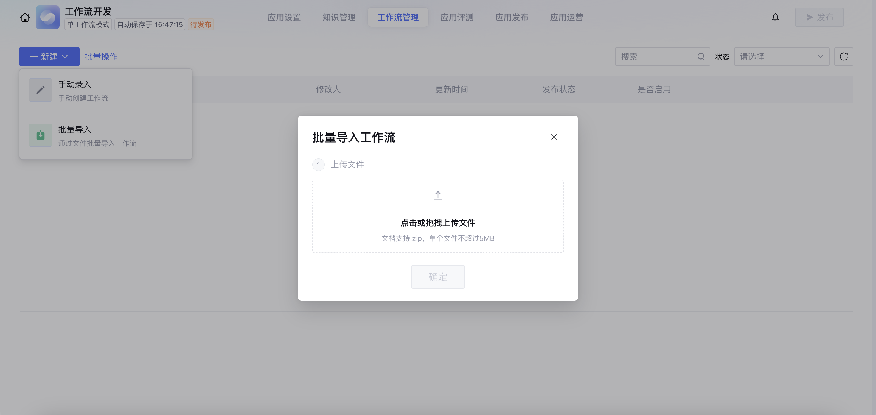 1.1 单击批量导入,上传智能体开发平台其他工作流导出的 zip 包,单个文件不超过5MB。