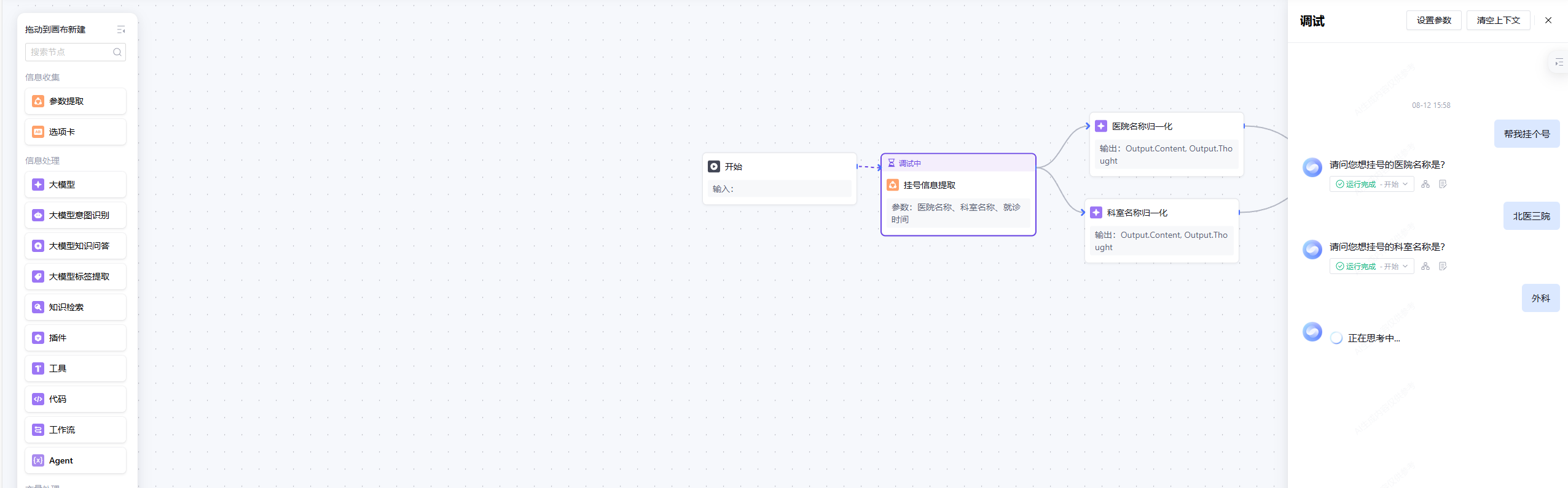 支持单节点调试的节点包括:参数提取、选项卡、大模型、大模型意图识别、大模型知识问答、大模型标签提取、知识检索、插件、工具、代码、工作流节点。
