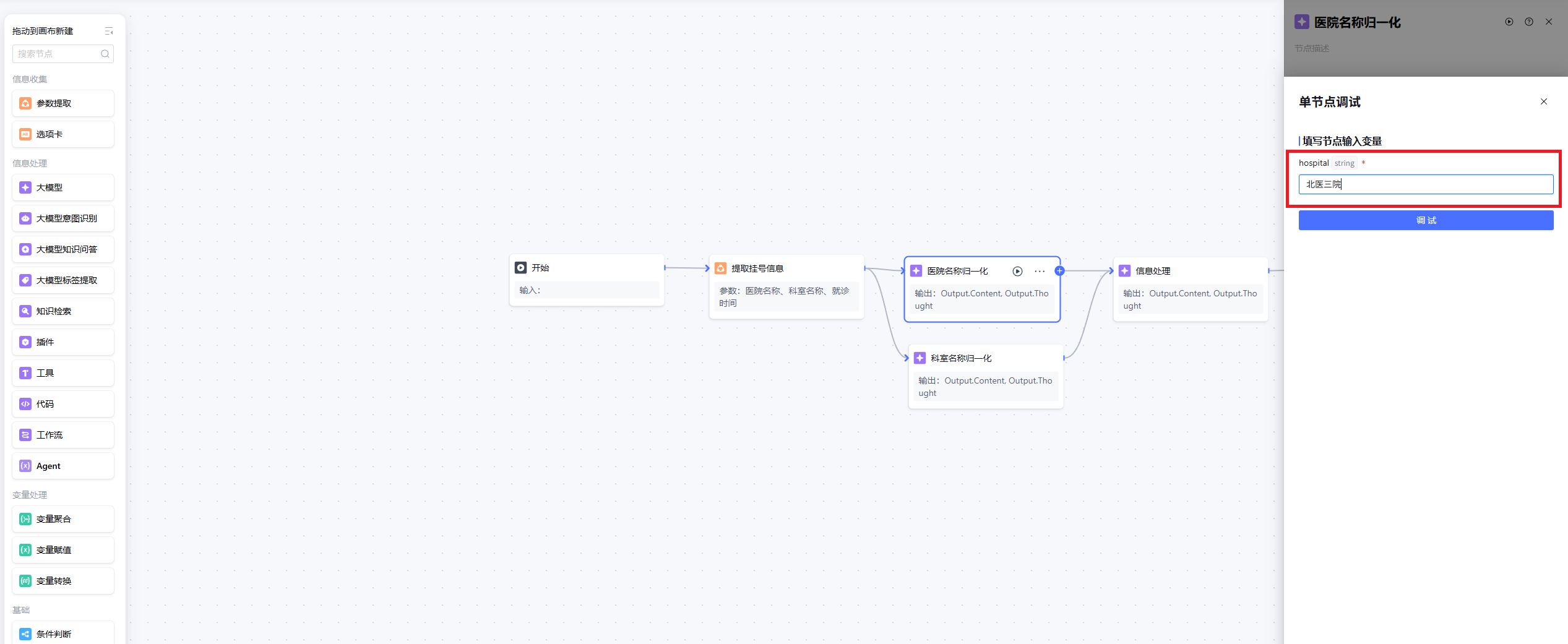 1.2 在调试窗中填写该节点的必填输入参数,单击调试。