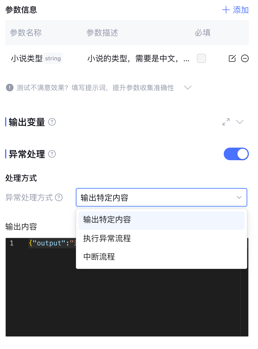 异常处理方式 | 支持“输出特定内容”、“执行异常流程”和“中断流程”三种 |