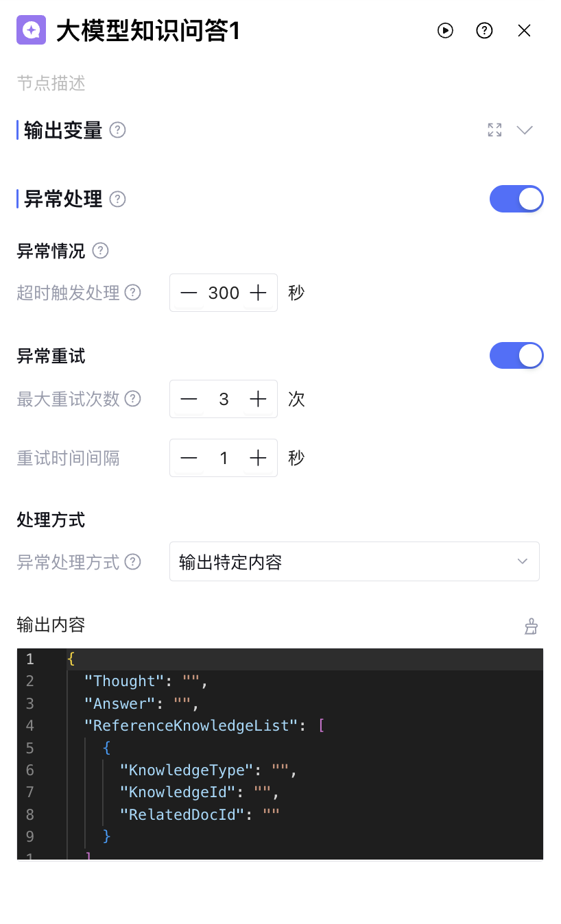 超时触发处理 | 节点运行的最大时长,超过时触发异常处理。大模型知识问答节点的超时时间默认值为300s,超时时间设置范围为1-600s |