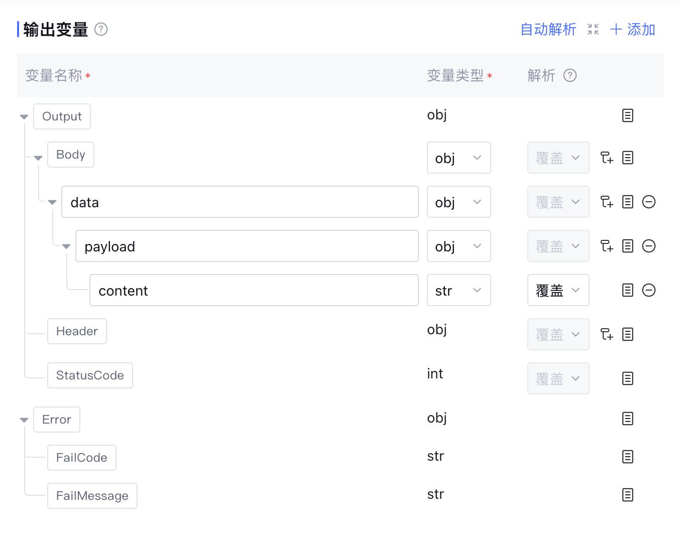 在完成基础信息与 API 参数配置后,系统还支持自动解析接口返回结构,并生成对应的输出变量,方便后续节点直接引用。