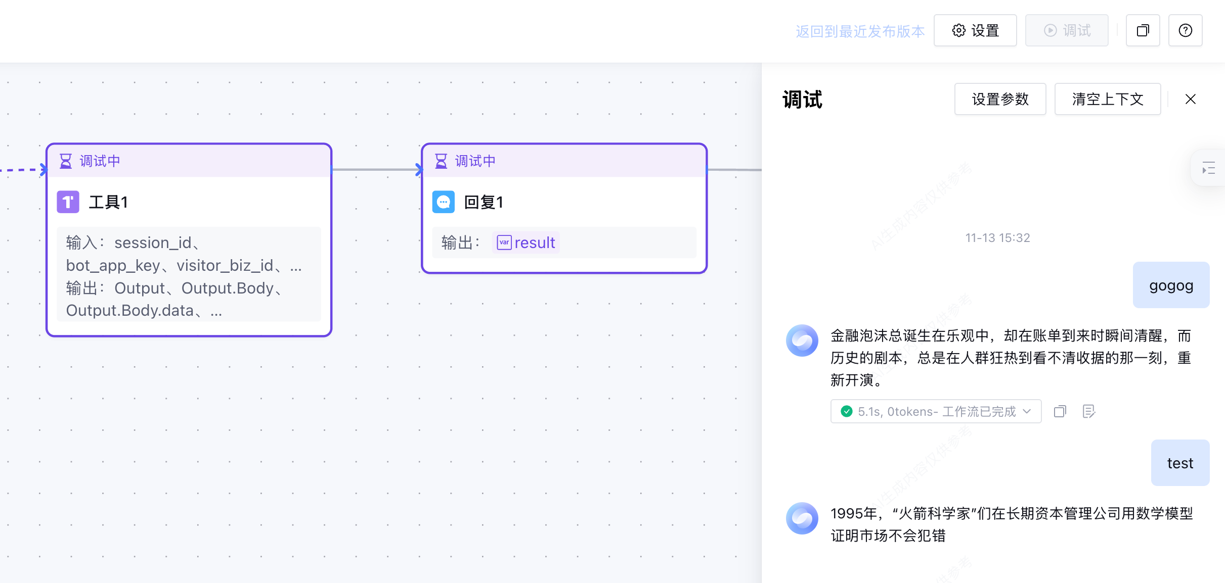 单击工作流右上角的调试,运行后即可看到 SSE 拼接后的最终回复内容。