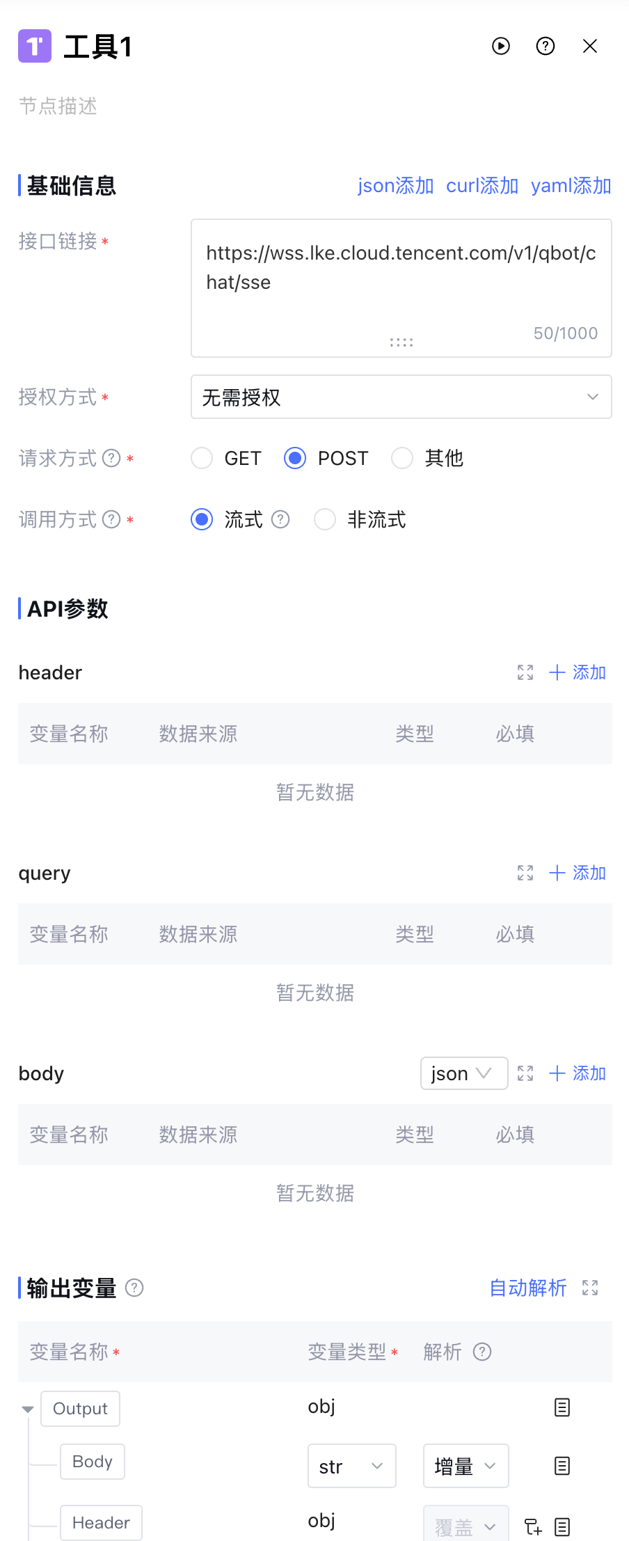 在工具节点中配置 POST 请求方式与流式调用方式。