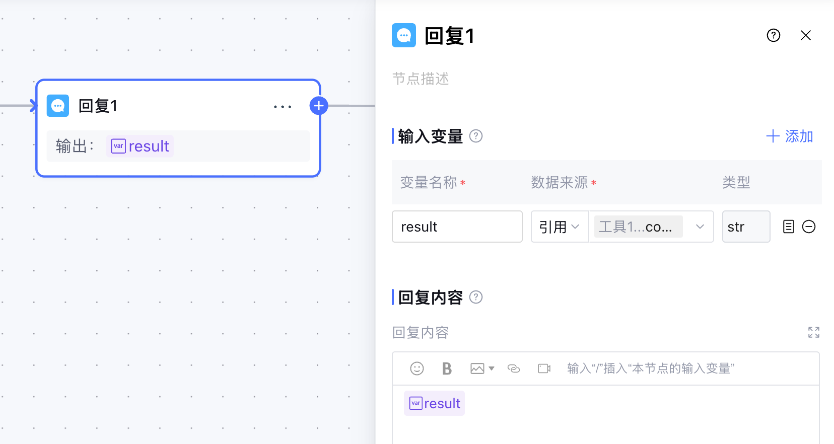 在工具节点后添加一个“回复节点”,并在回复内容中插入工具节点的输出变量,例如