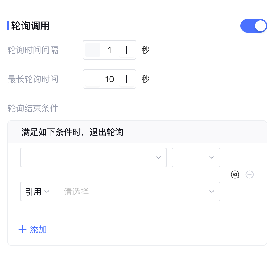 可手动开启轮询调用(默认为关闭),满足异步任务运行等场景需求。用户可手动配置轮询条件。