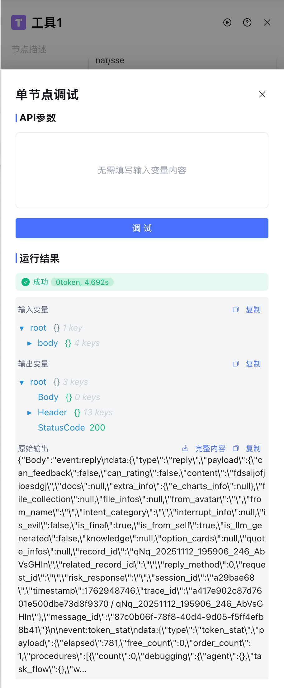 注意:工具节点内部不会实时渲染流式内容,而是后台自动拼接完整结果。如需查看流式输出效果,请在节点后追加「回复节点」,详情见后文。