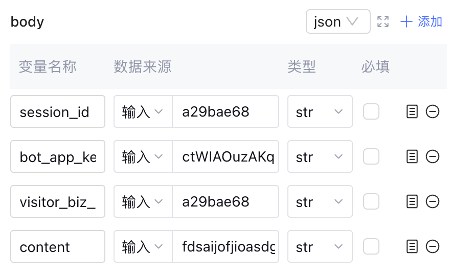 根据请求示例,在工具节点 Body 中填写例如以下参数: